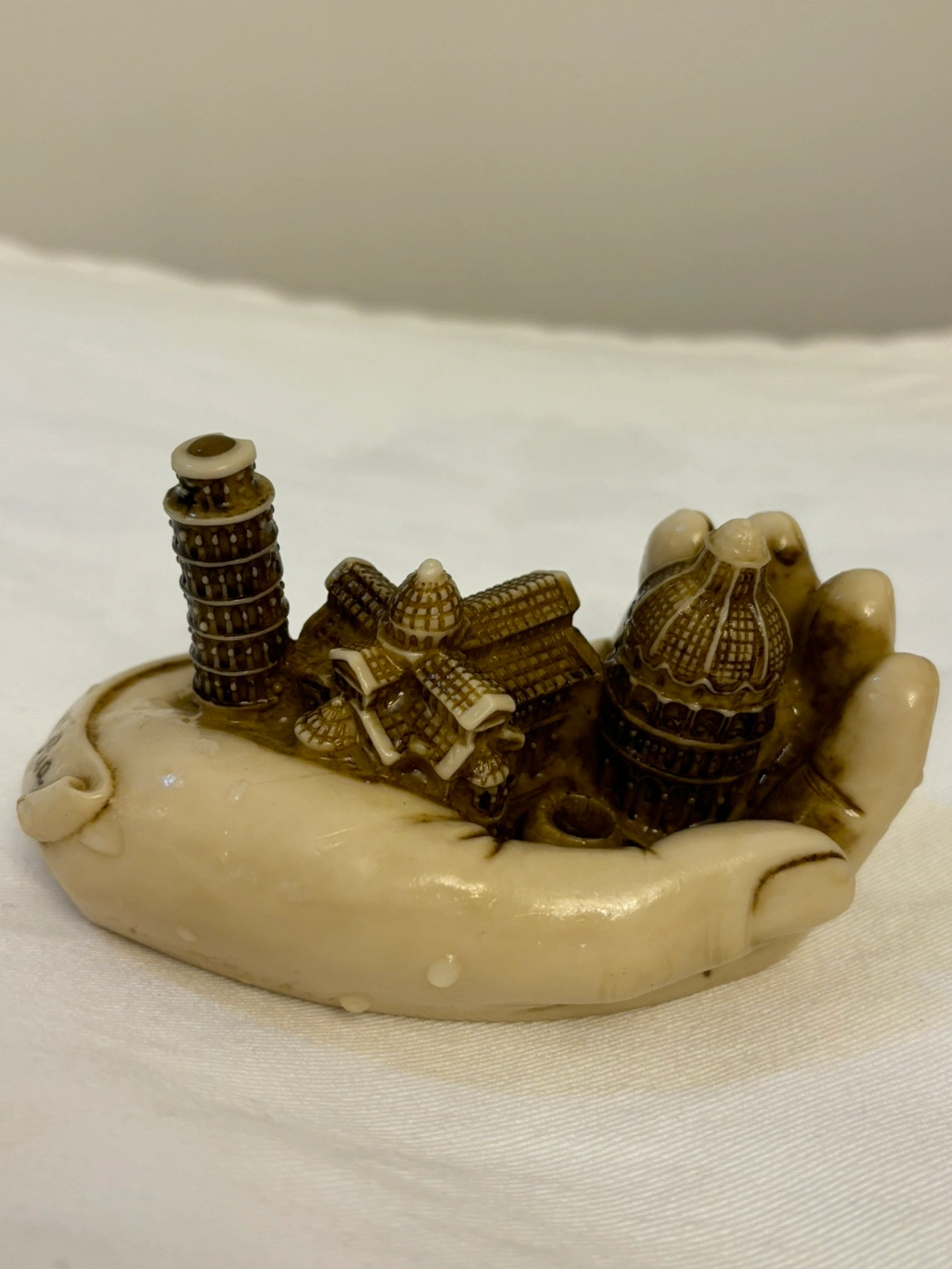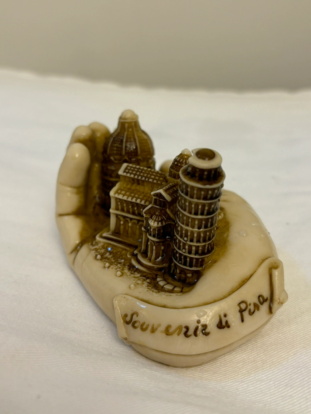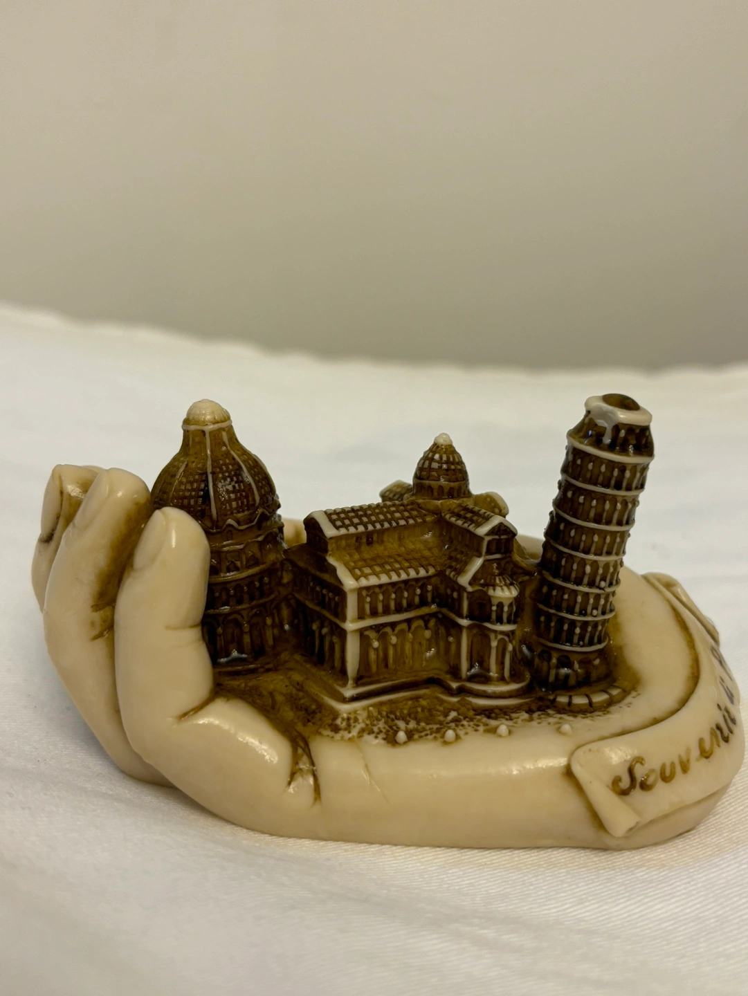 A small figurine of the Leaning Tower of Pisa, the Duomo, and a church. The figurine is in the shape of a hand, and has the inscription "Souvenir di Pisa."