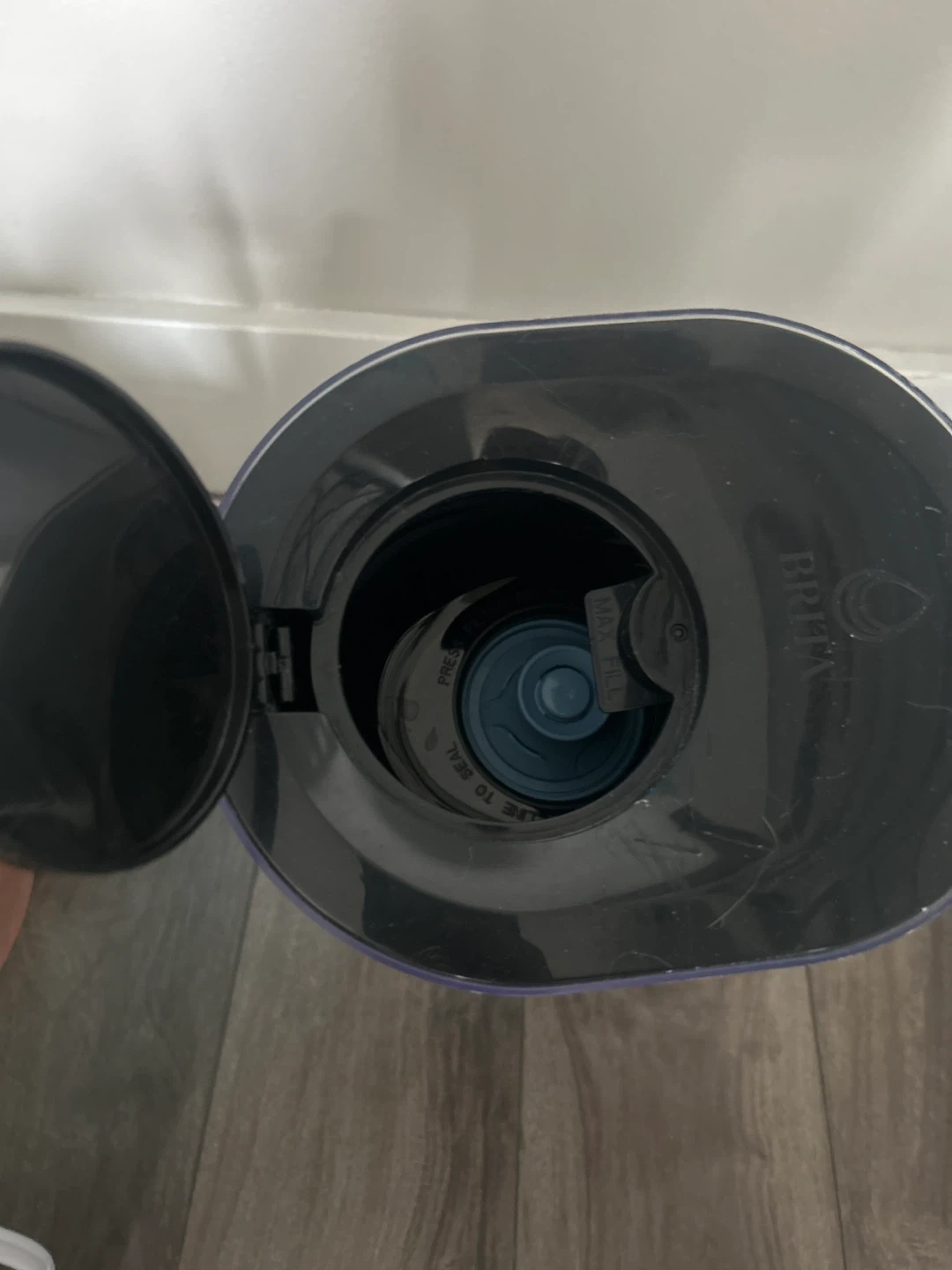 Brita water filter pitcher. It's a clear pitcher with a black lid and a blue filter housing. Great for reducing tap water impurities! Filter included ONLY tap water has been put through the filter.