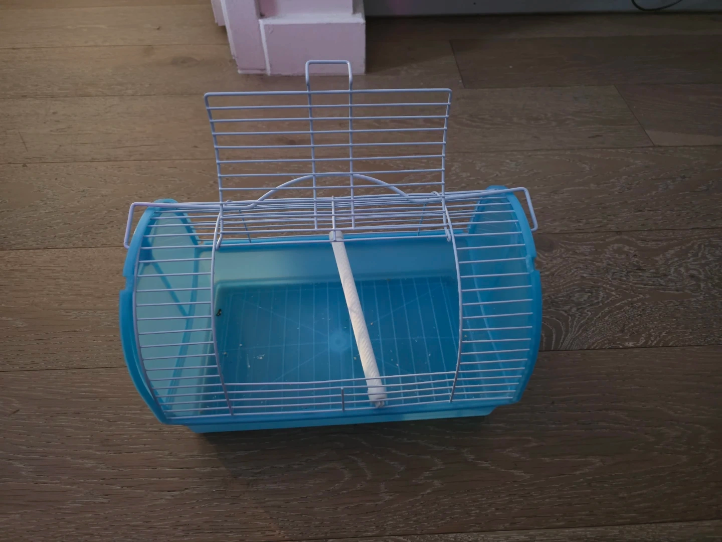 This is a blue small animal cage with a wire top and plastic base. It includes a swing and a carry handle. Perfect for transporting small pets.