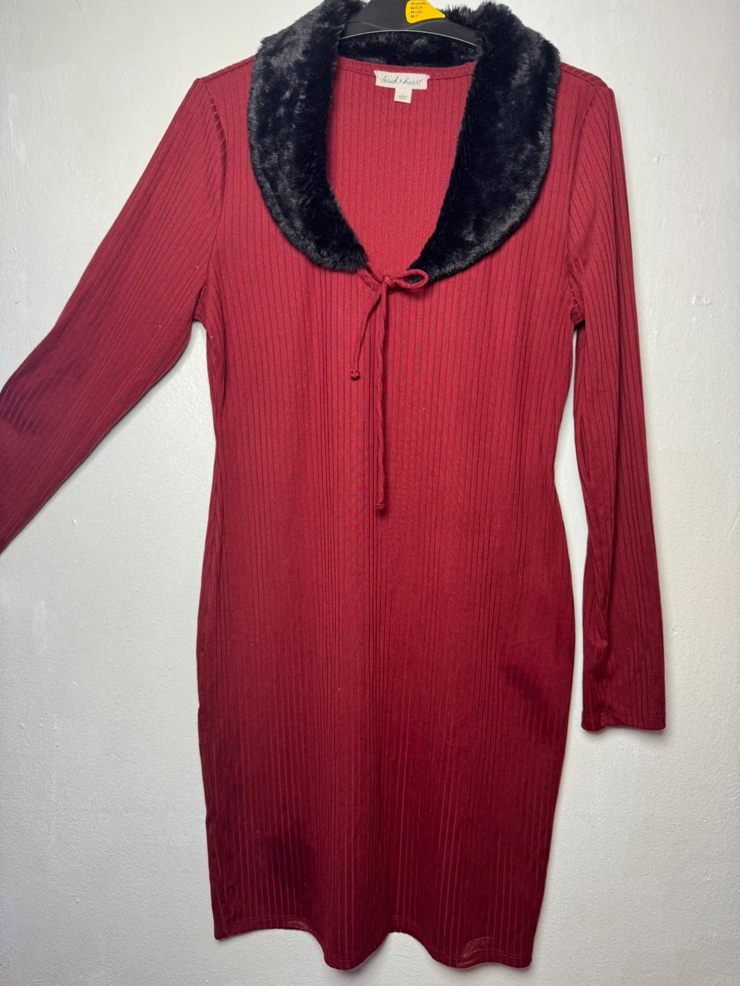 Derek Heart burgundy long-sleeve dress with a faux fur collar and tie detail. Ribbed knit material. Size large.