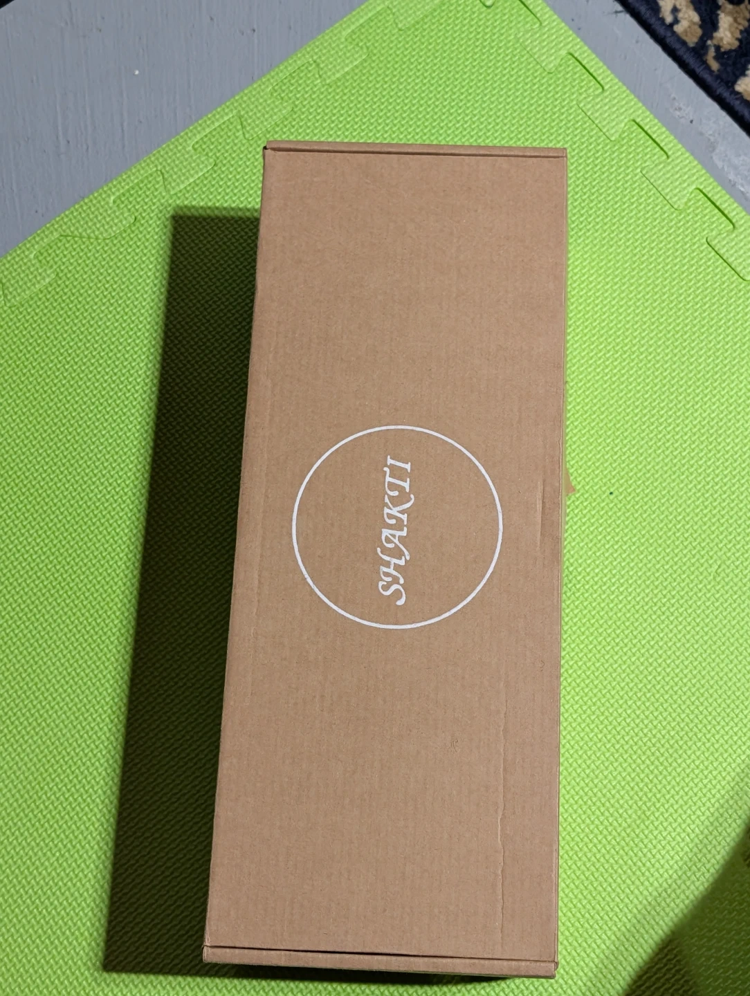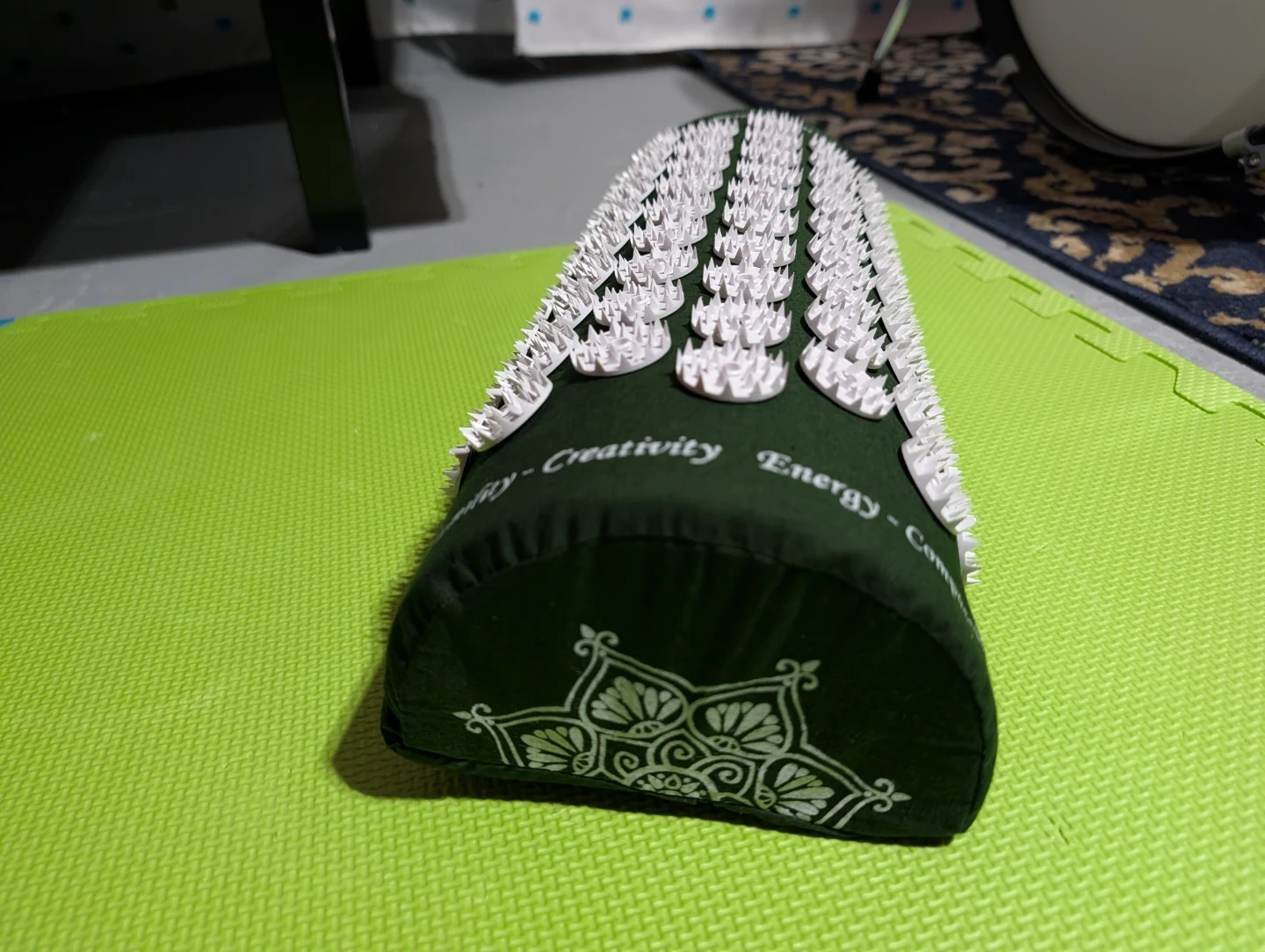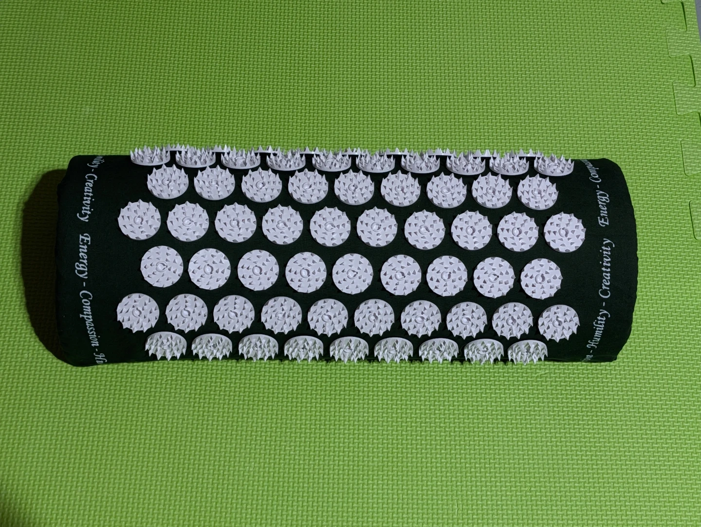 This SHAKTI acupressure mat and pillow set is dark green. It includes the mat and a supportive pillow, both covered in stimulating spikes. The set comes in its original cardboard box.