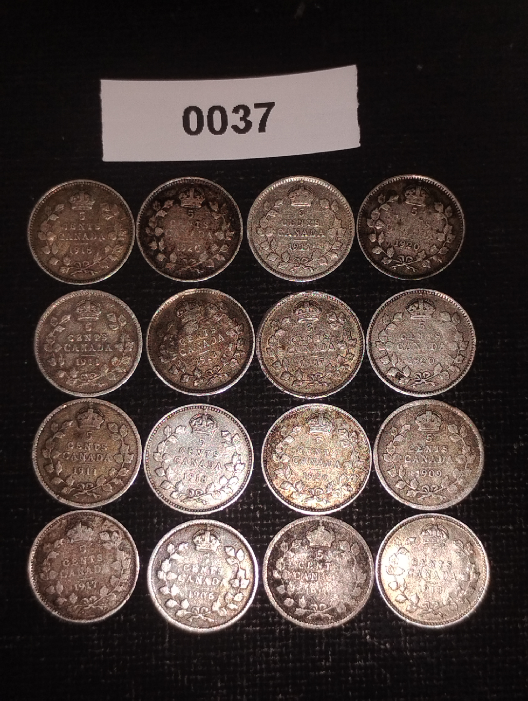 16 pieces Vintage Silver Canadian 5 Cent Coins - 1915-1920