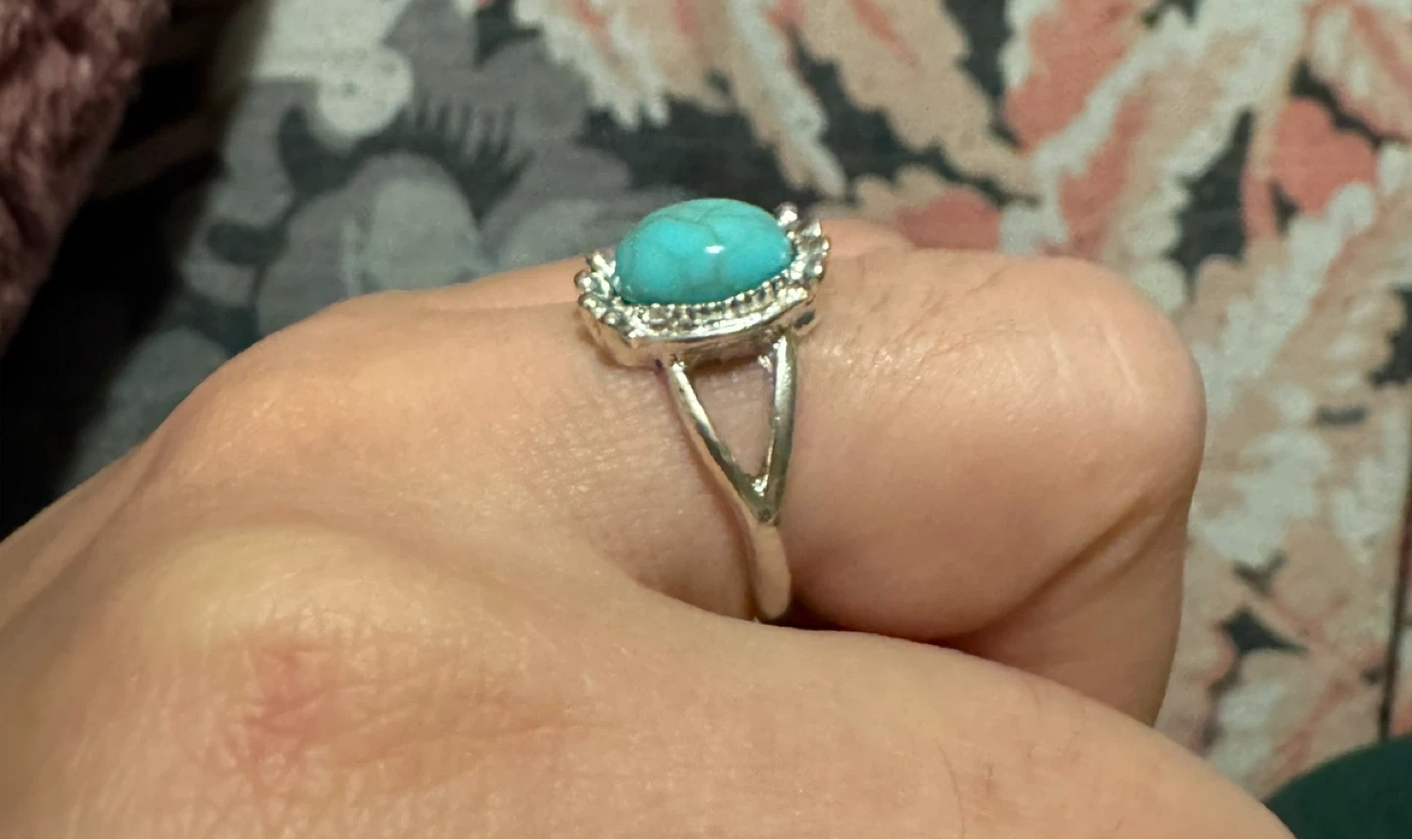 A lovely silver-tone ring featuring a vibrant turquoise stone. The setting has a decorative, slightly antiqued look. This ring's design makes it a nice accessory for everyday wear or to add a pop of colour to an outfit.