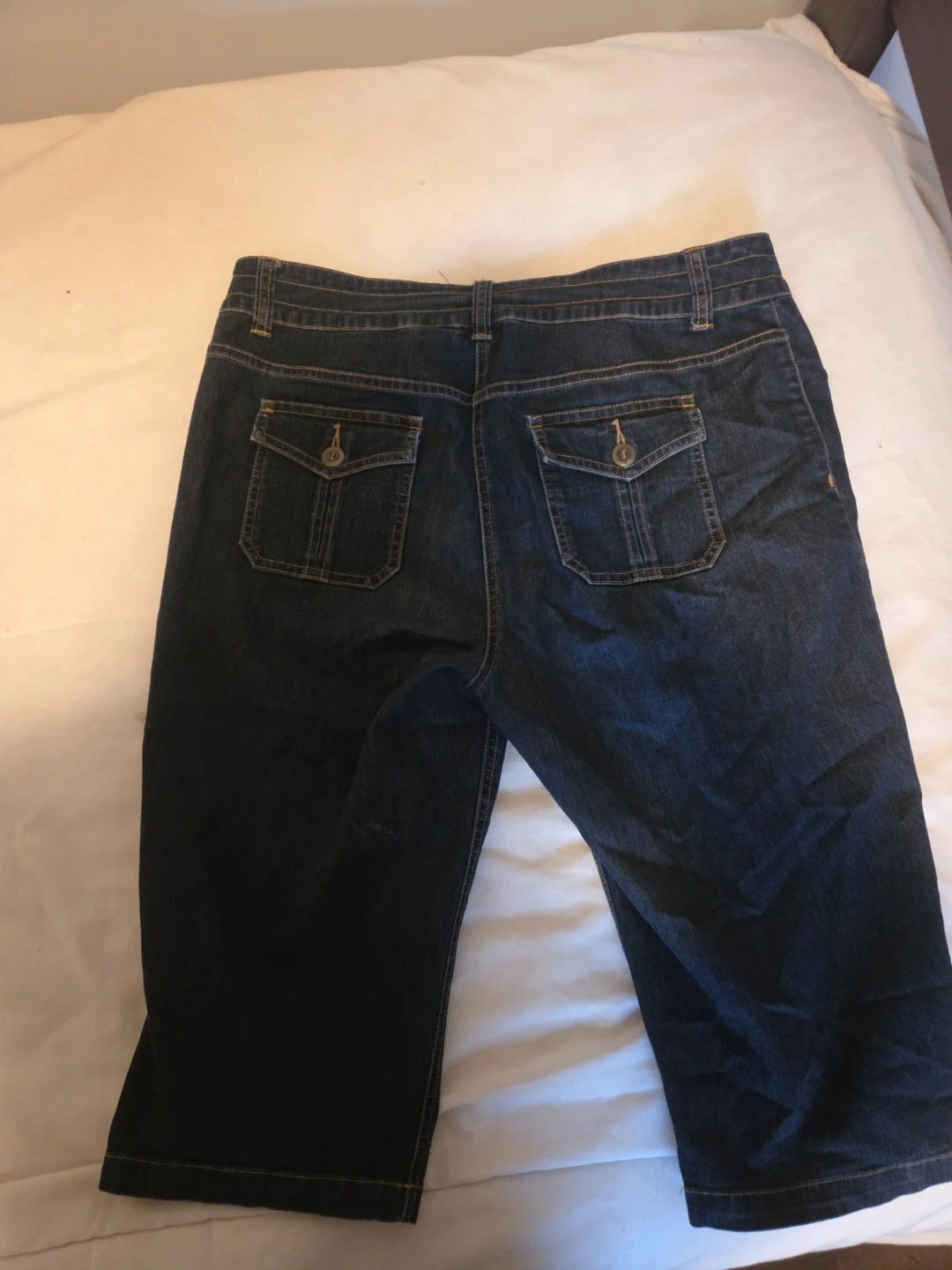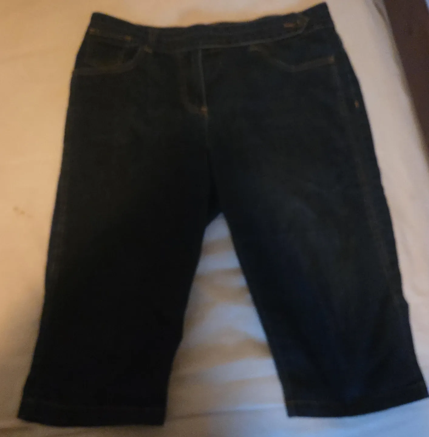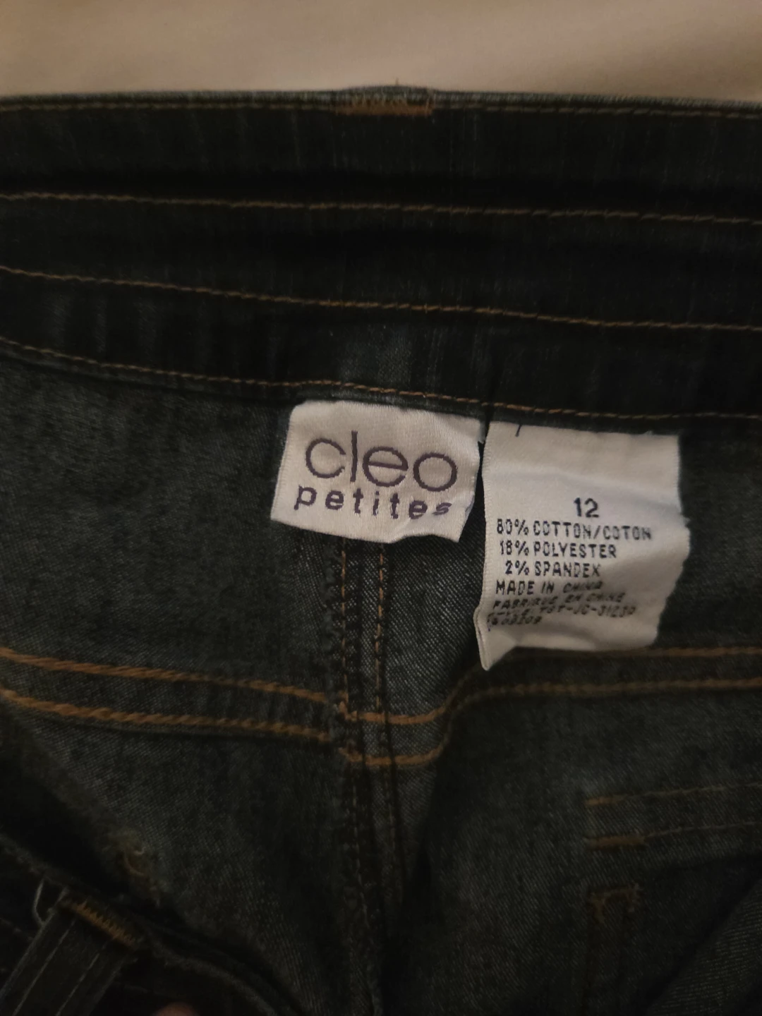 These are dark wash denim capris from Cleo Petites. Made with 80% cotton, 18% polyester, and 2% spandex for a comfortable fit. Perfect for casual wear!