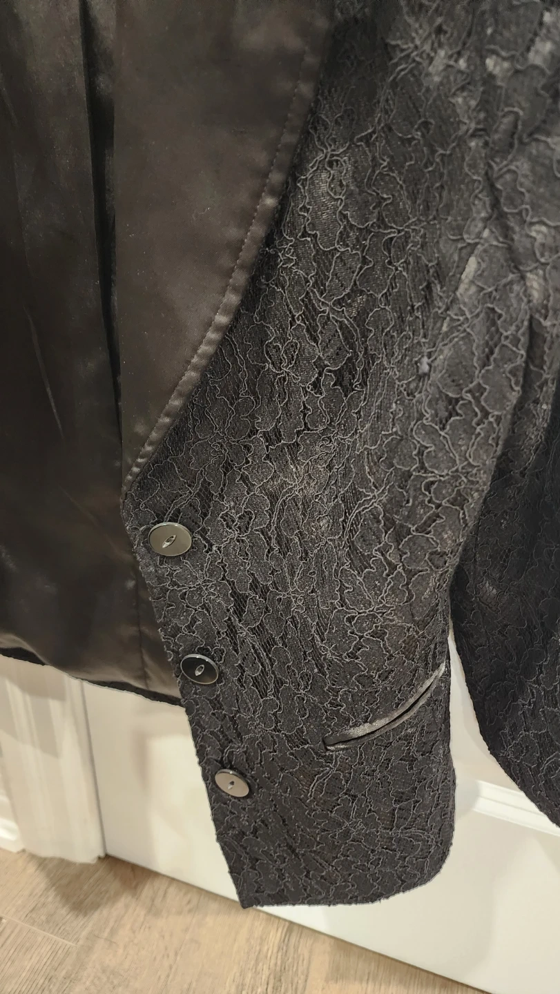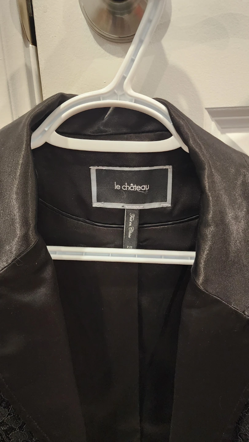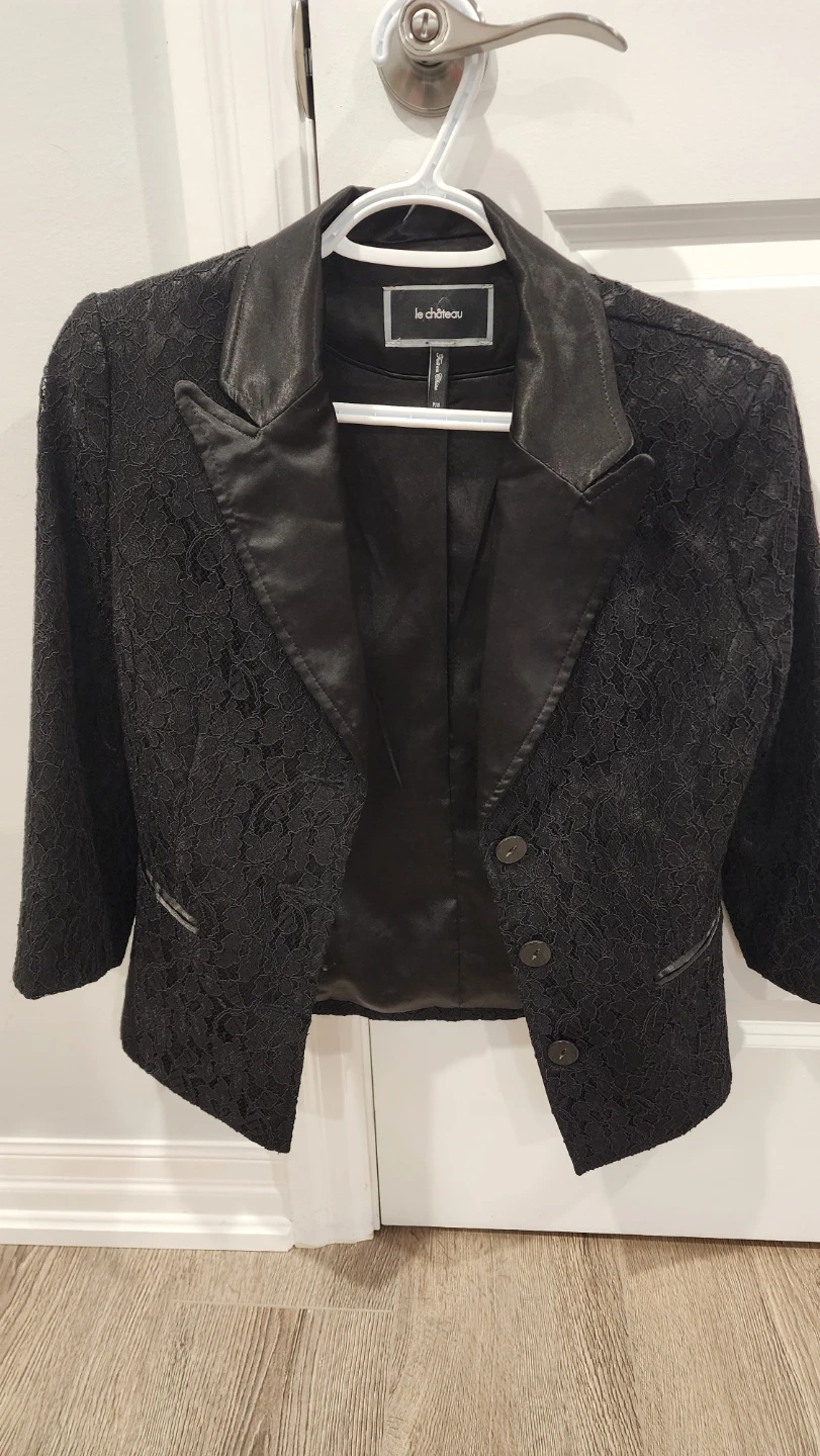 Selling a stylish black lace blazer from Le Chateau. It's a size P/S (Petite Small) and features a unique design with silk-like trim. Perfect for dressing up or adding a touch of elegance to any outfit!