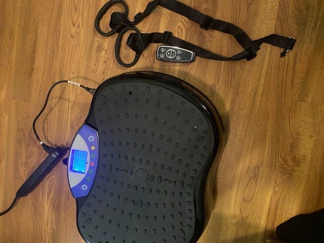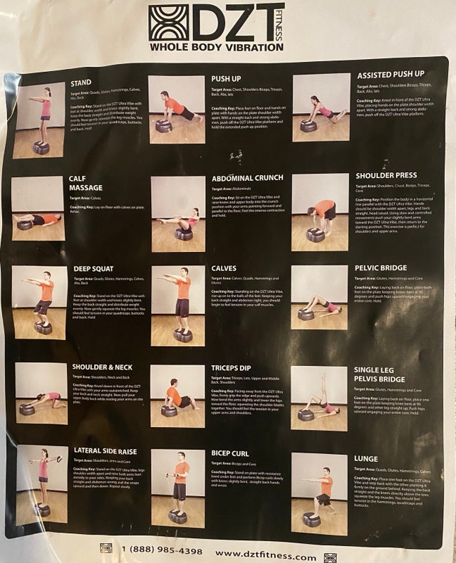 Get ready to shake things up with this DZT Fitness mini vibration plate! This whole body vibration machine is perfect for a quick workout, 10 minutes, 3 times a week! This item is used, but it is in great condition and comes with the user manual and training DVD to maximize your fitness goals. Specifications: Brand: DZT Fitness Type: Whole Body Vibration Plate. Cash accepted.