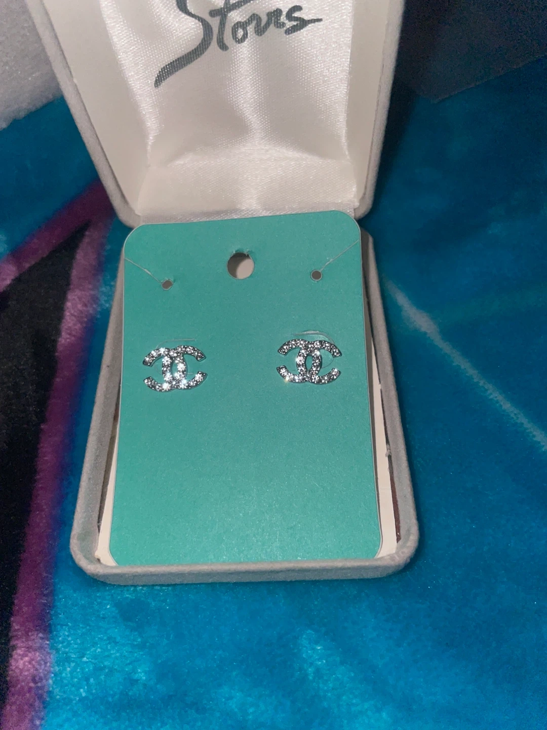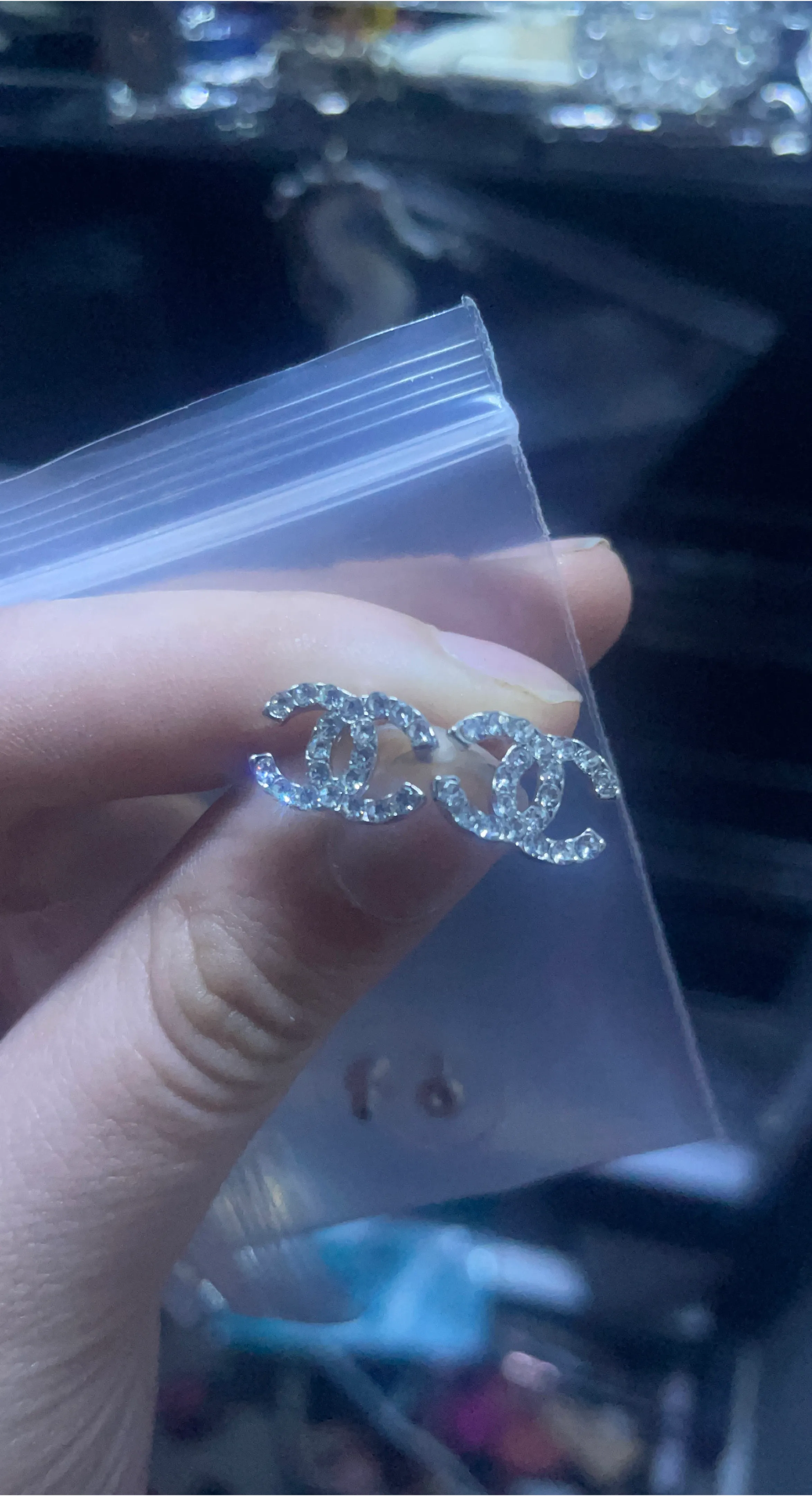 Spa rolling Chanel CC stud earrings. These statement earrings feature the iconic Chanel logo encrusted with clear stones. Perfect for adding a touch of luxury to any outfit!