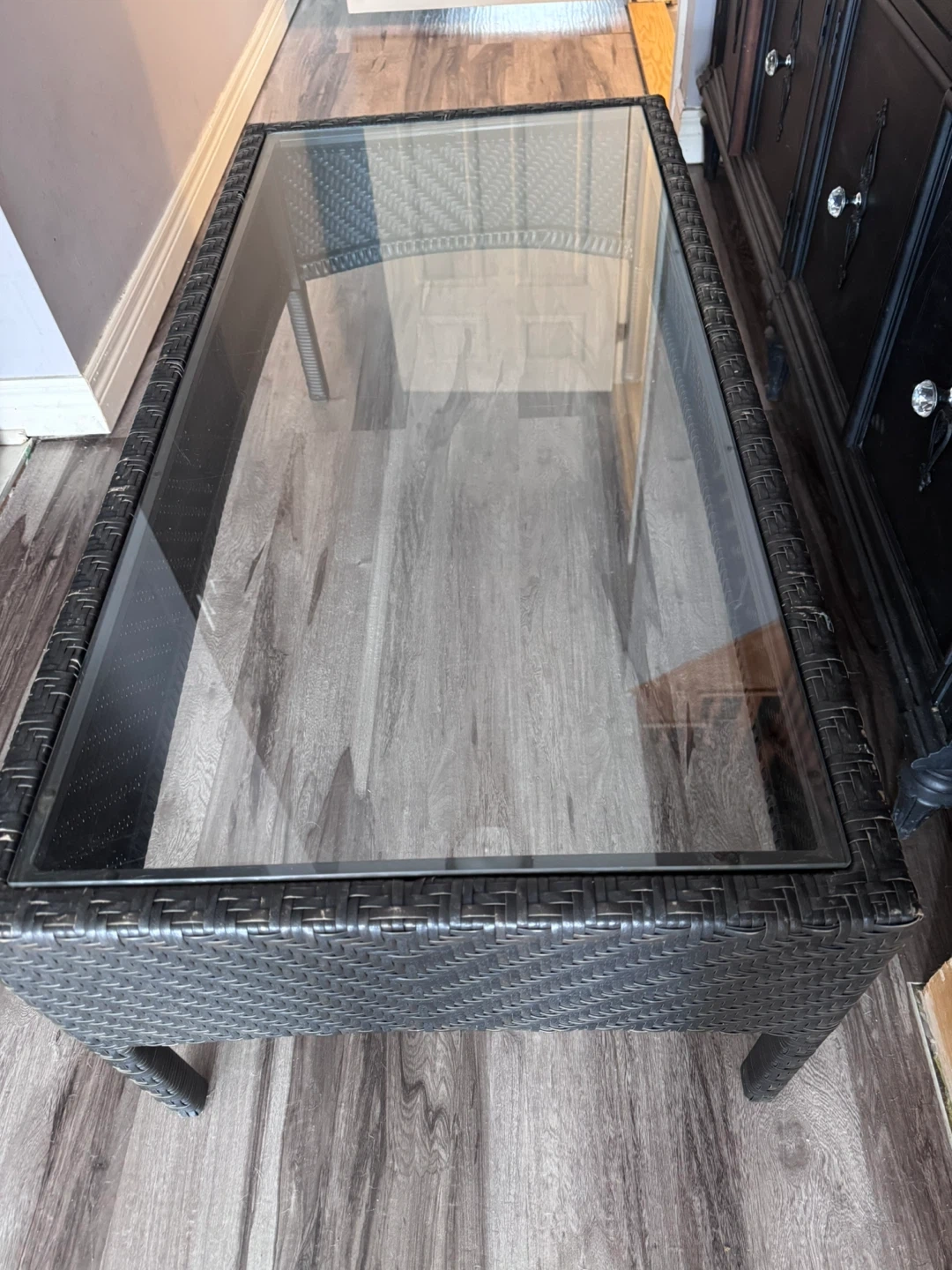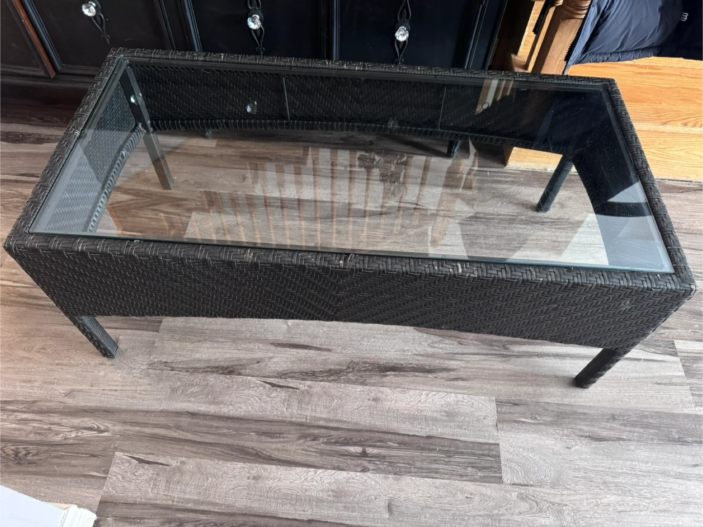 This rectangular coffee table features a dark wicker weave frame with a clear glass top. It has a sturdy construction and would look great an out door living space or sunroom. The glass top is removable for easier cleaning.