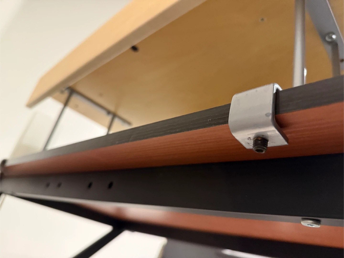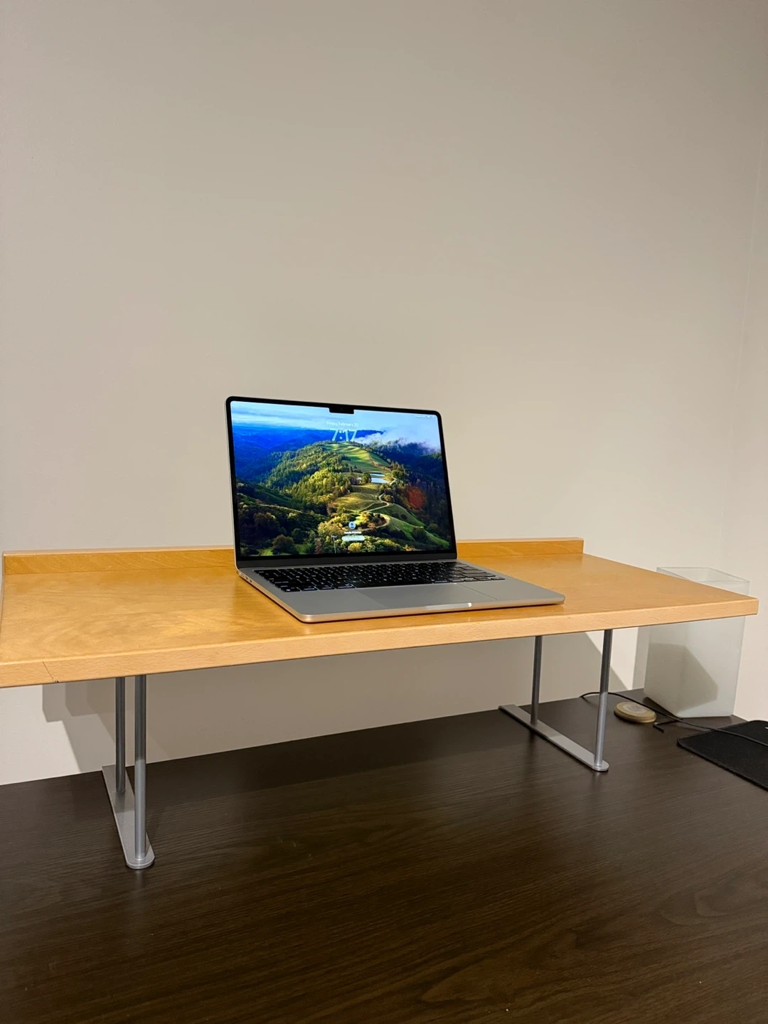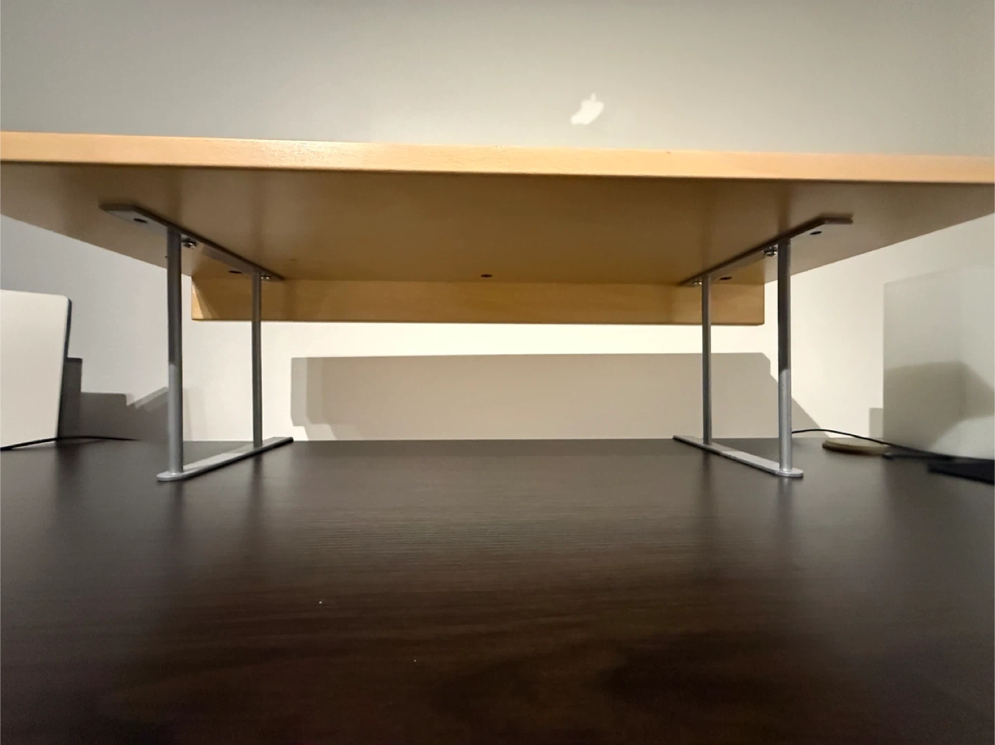 Raise your laptop for better ergonomics. This wooden stand has a light wood finish and metal legs. It's a simple and stylish way to improve your desk setup. This stand is great for elevating your screen to eye level. It measures 22" wide by 11" deep.