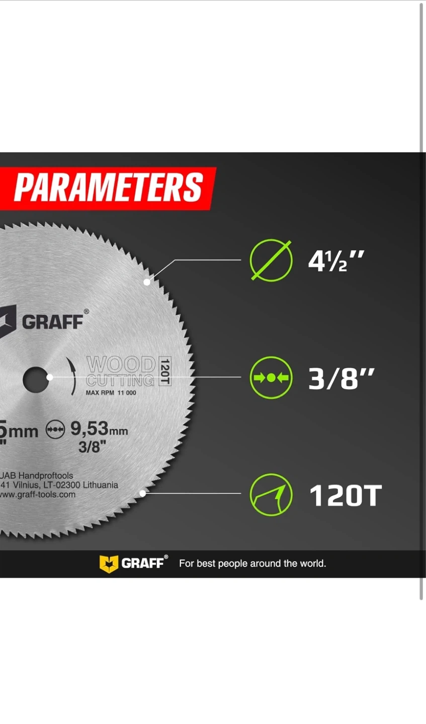 Graff wood cutting saw blade, 4.5" diameter with 120 teeth. Designed for clean cuts on wood, raw wood, laminate, and MDF. Offers fast cutting and no kickback for a safer experience.