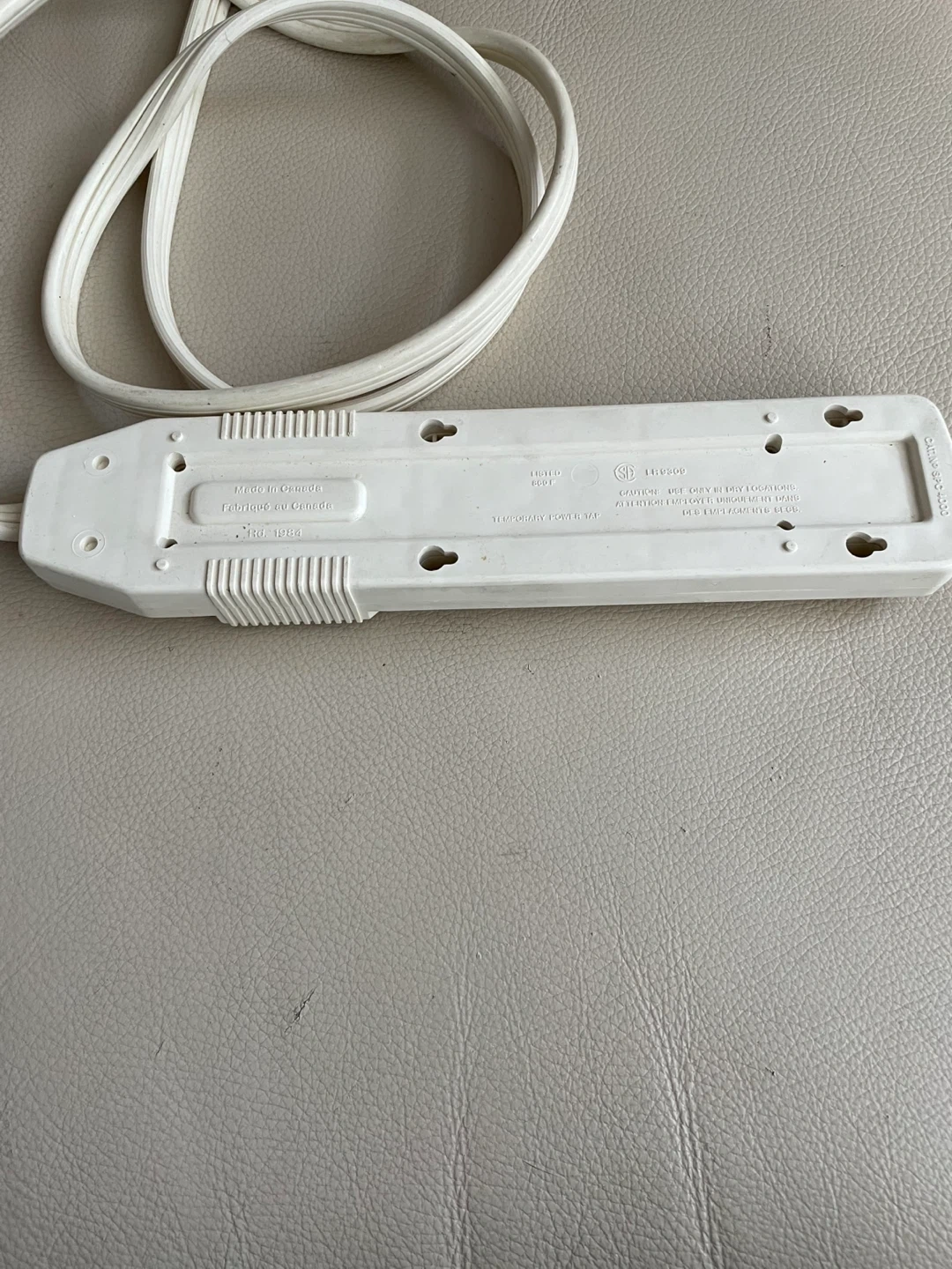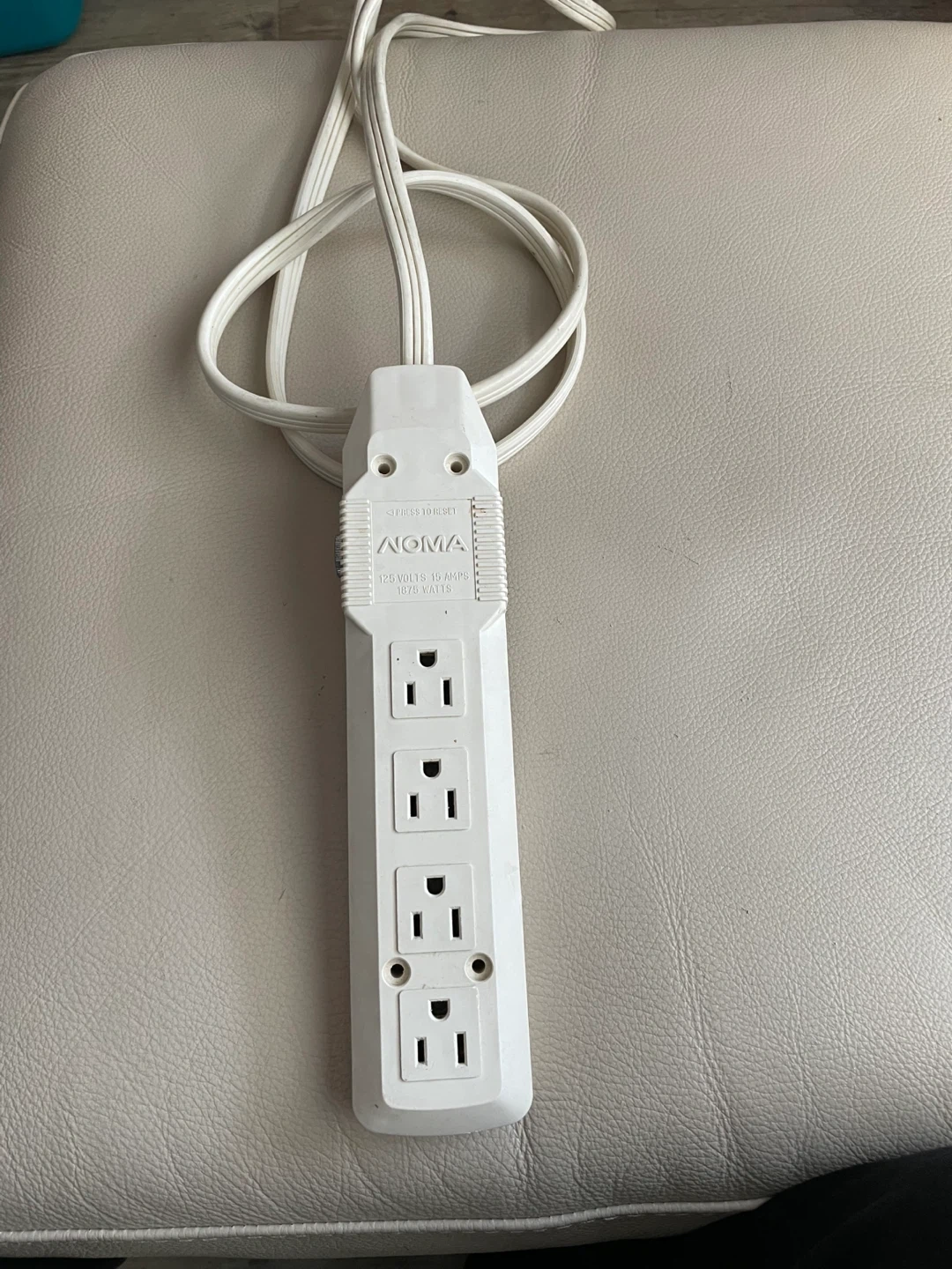 This white NOMA power bar has four outlets. It's rated for 125 volts, 10 amps, and 1250 watts. Made in Canada.