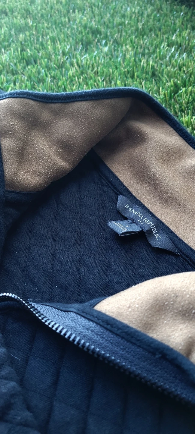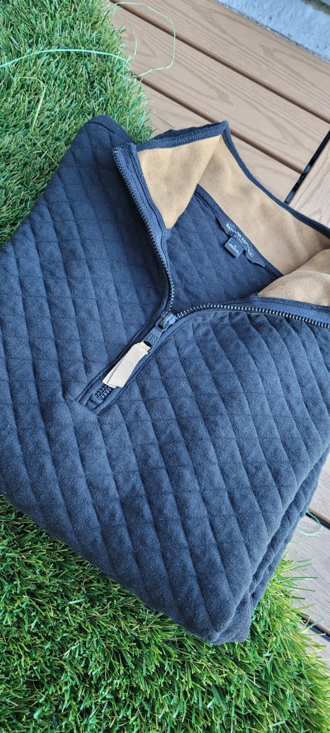 This is a Banana Republic quilted pullover with a 1/4 zip closure. It features a contrasting tan collar. The material is soft and comfortable.