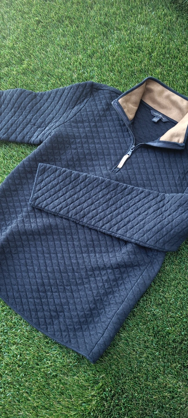 This is a Banana Republic quilted pullover with a 1/4 zip closure. It features a contrasting tan collar. The material is soft and comfortable.