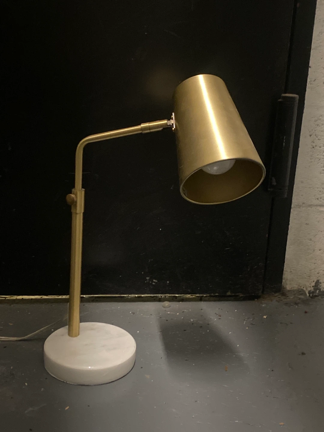 This adjustable desk lamp features a brass finish shade and arm. It has a sturdy marble base. The adjustable arm allows for directed lighting. Light bulb included