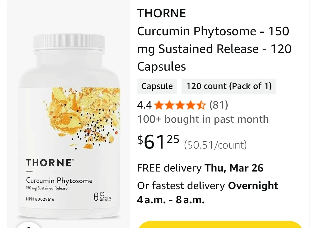 Buy & SellThorne Curcumin Phytosome 120 CapsulesThorne Curcumin Phytosome 120 Capsules$45Thorne Curcumin Phytosome supplement. Each bottle contains 120 capsules. Expiry date is July 2028.ConditionNewBrandThorneWHERE TO MEETSaint Clair Avenue WestView MapSELLERverifieddixiCorso Italia74360 reviews0 chats·0 favorites·2 viewsSEND CHAT TO SELLERHi dixi! I’m interested in your listing.Hi dixi! I’m interested in your listing.Get the Karrot app to chatSign In to chat