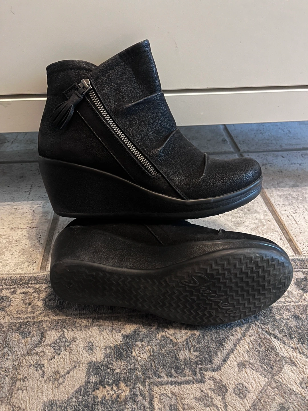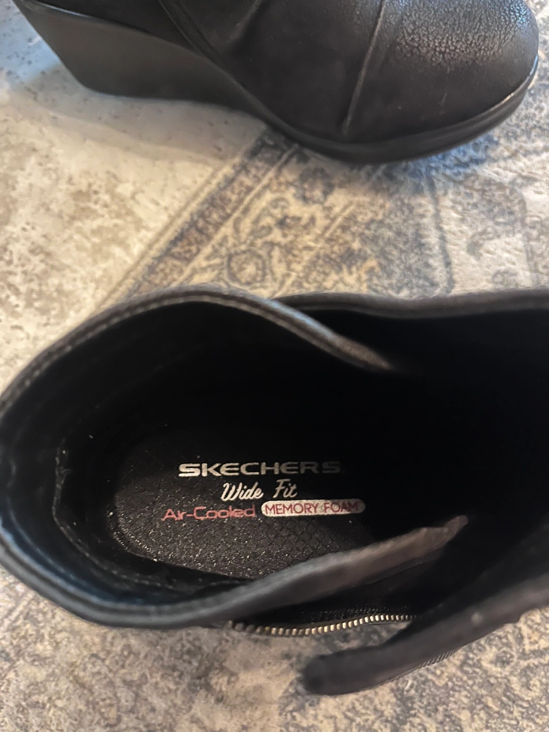 These are a pair of Skechers black ankle boots in a wide fit. They have a stylish wedge heel and a zipper detail on the side. The insole features Air-Cooled Memory Foam for extra comfort