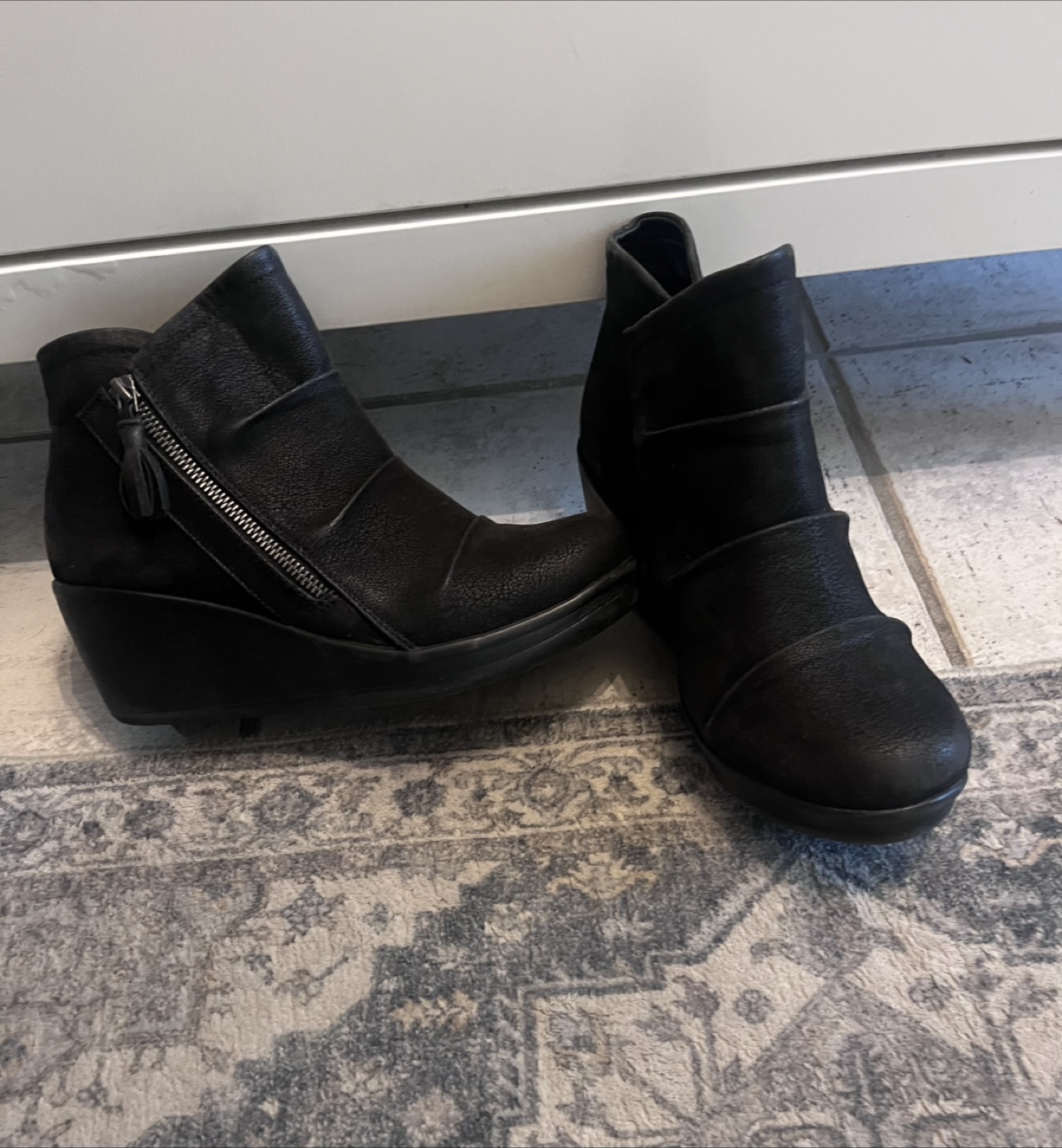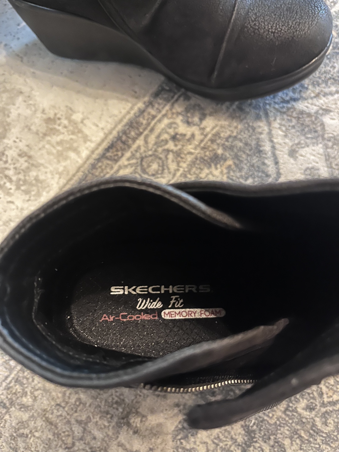 These are a pair of Skechers black ankle boots in a wide fit. They have a stylish wedge heel and a zipper detail on the side. The insole features Air-Cooled Memory Foam for extra comfort