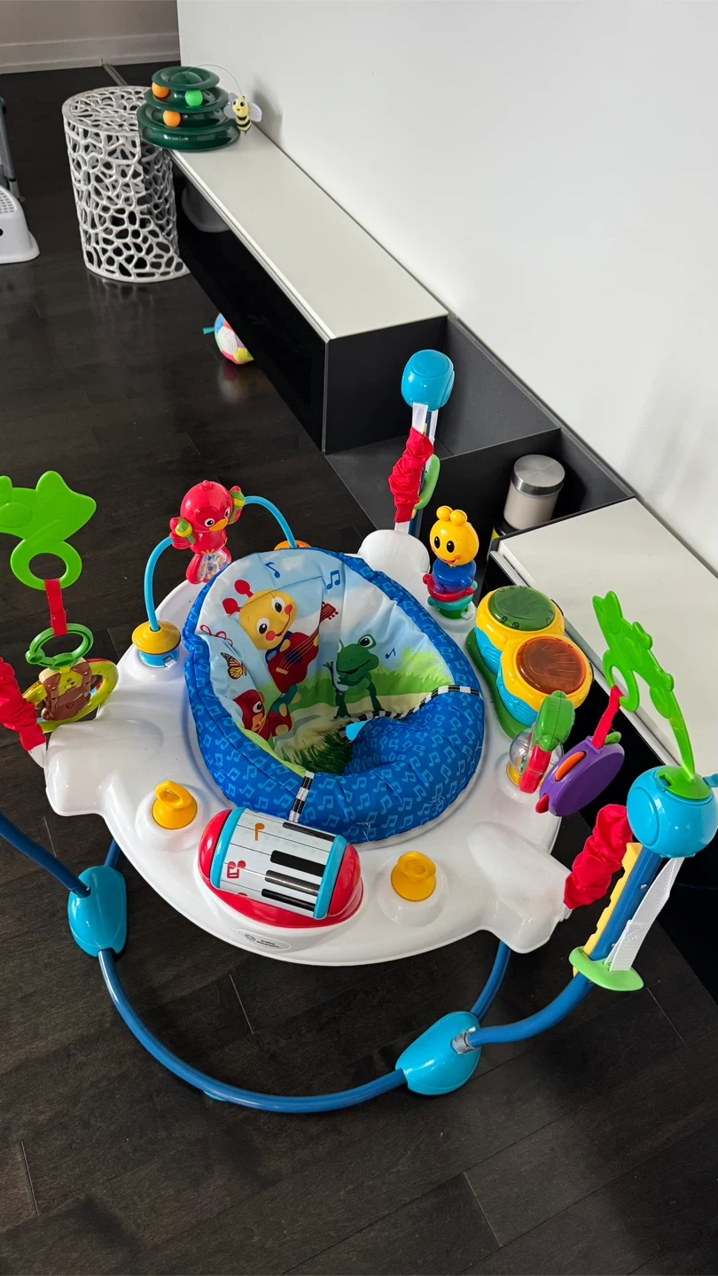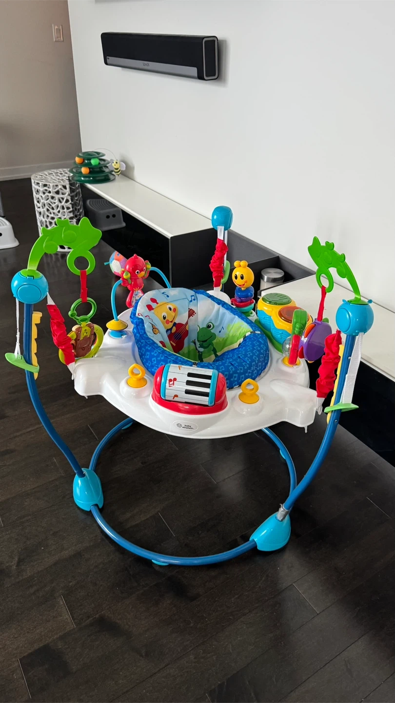 This Baby Einstein jumper is for babies to play and bounce in. It has various toys and musical elements attached for entertainment. It's blue and white with colourful interactive toys.