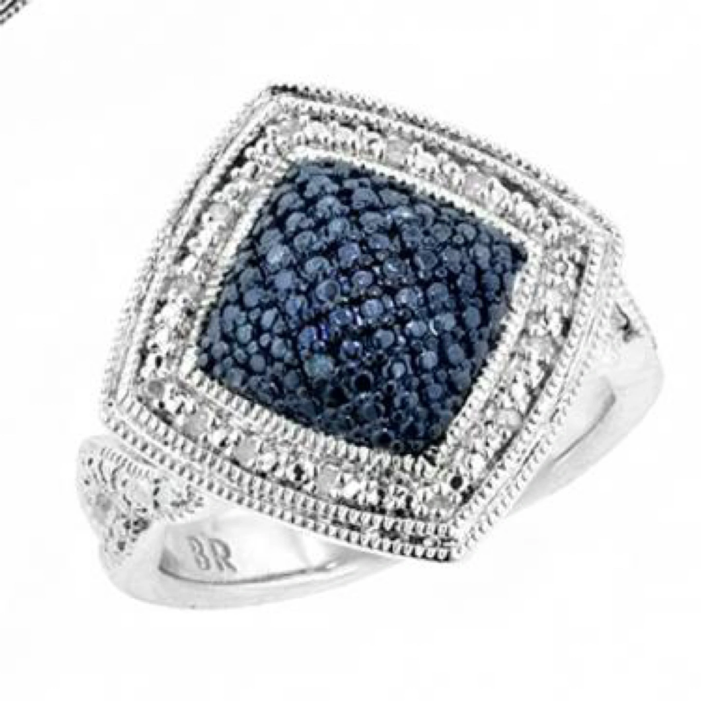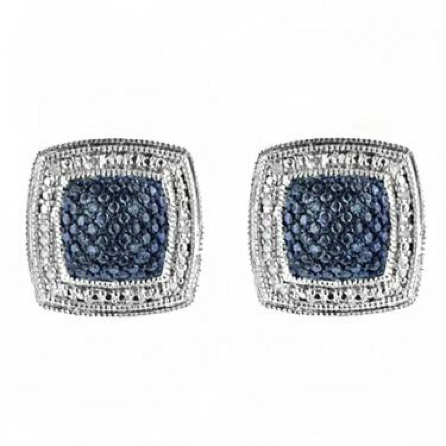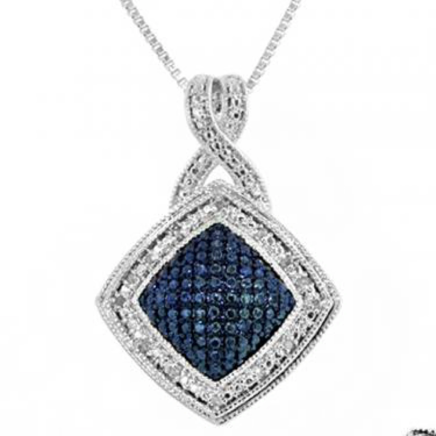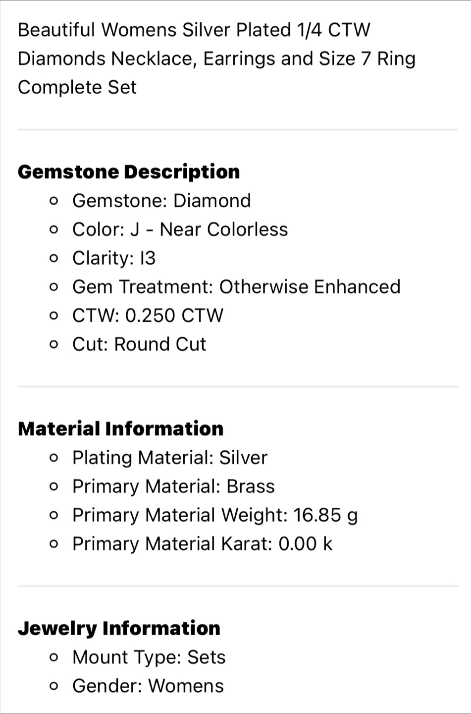 Beautiful women's jewellery set. Includes necklace, earrings, and size 7 ring. Silver plated with diamonds. Features square designs. 0.250 CTW diamonds. Near colorless.