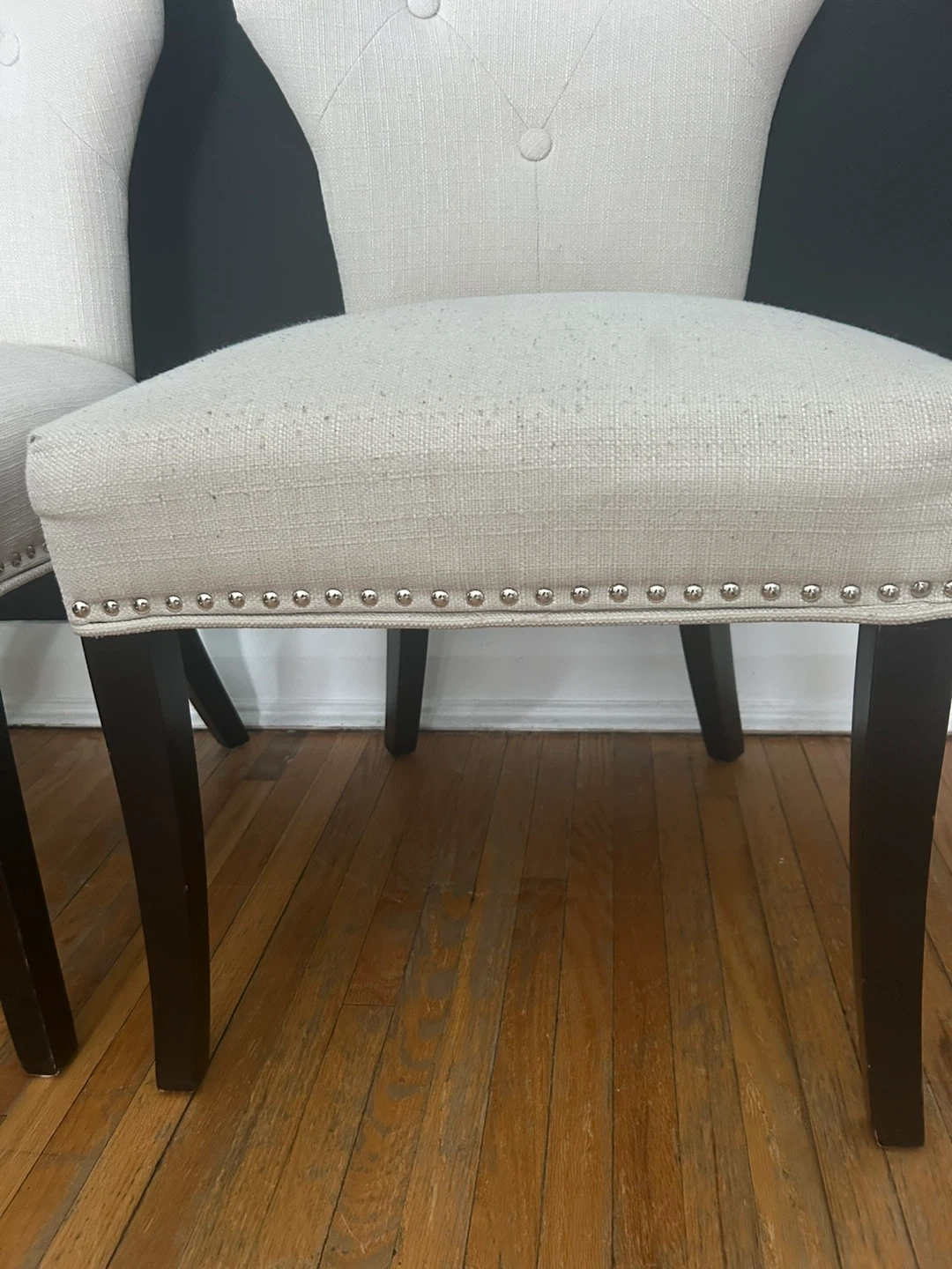 Set of two upholstered dining chairs with button tufting on the back. These chairs have nailhead trim detailing along the seat and back. They feature dark wood legs and a neutral linen-look fabric. Price is $70.