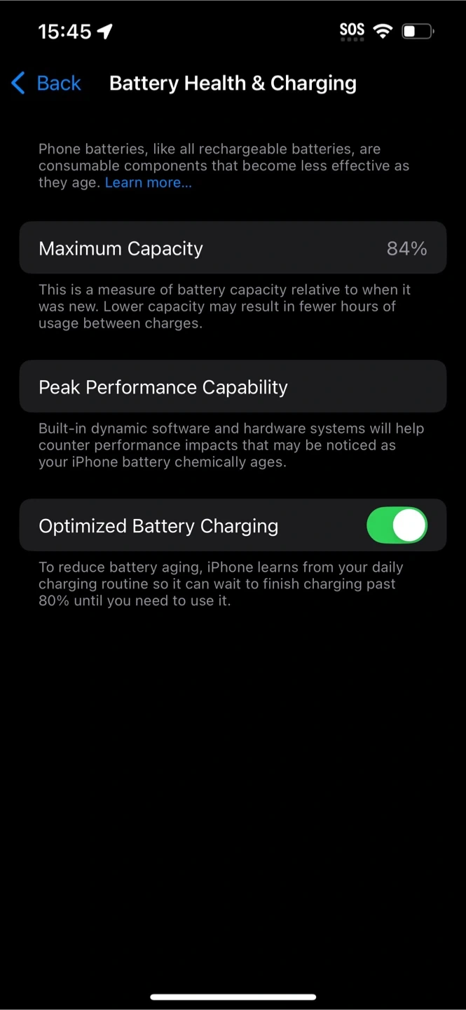 Maximum battery capacity is 84%.