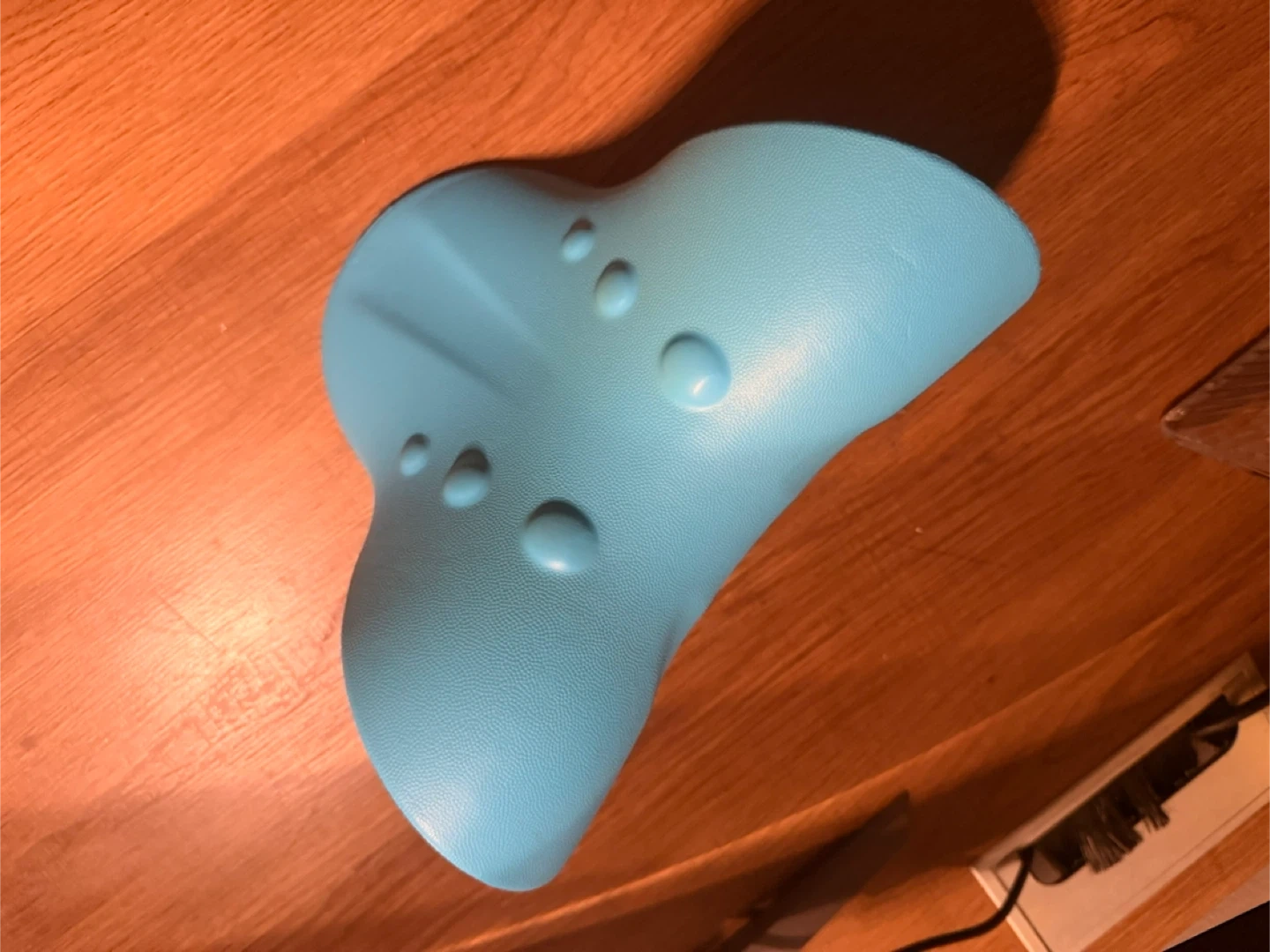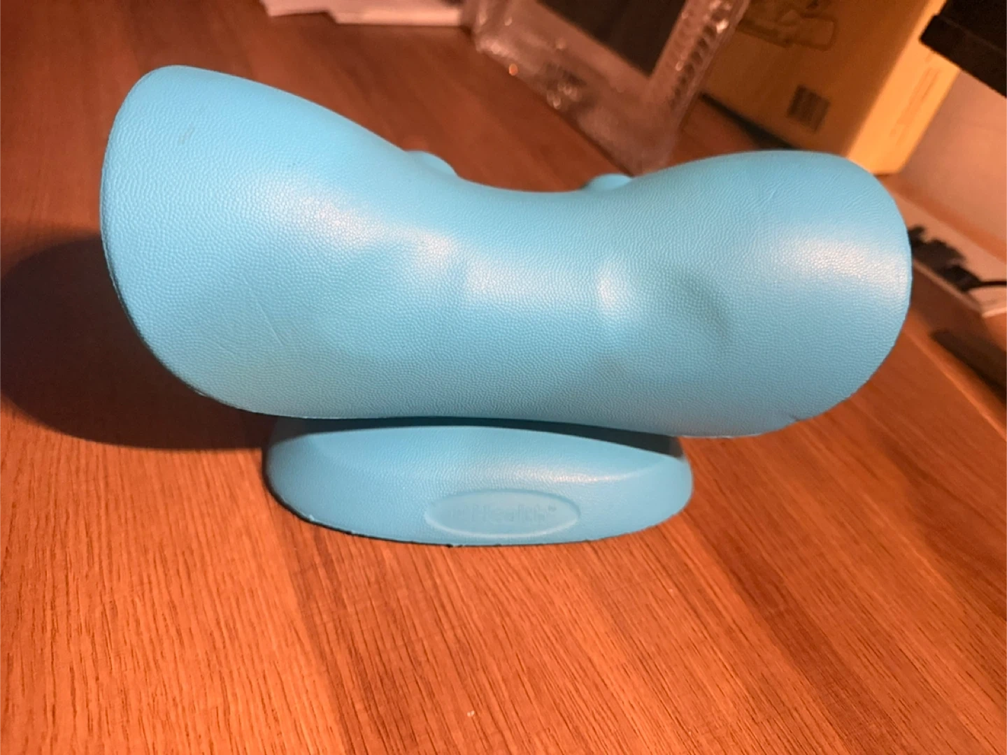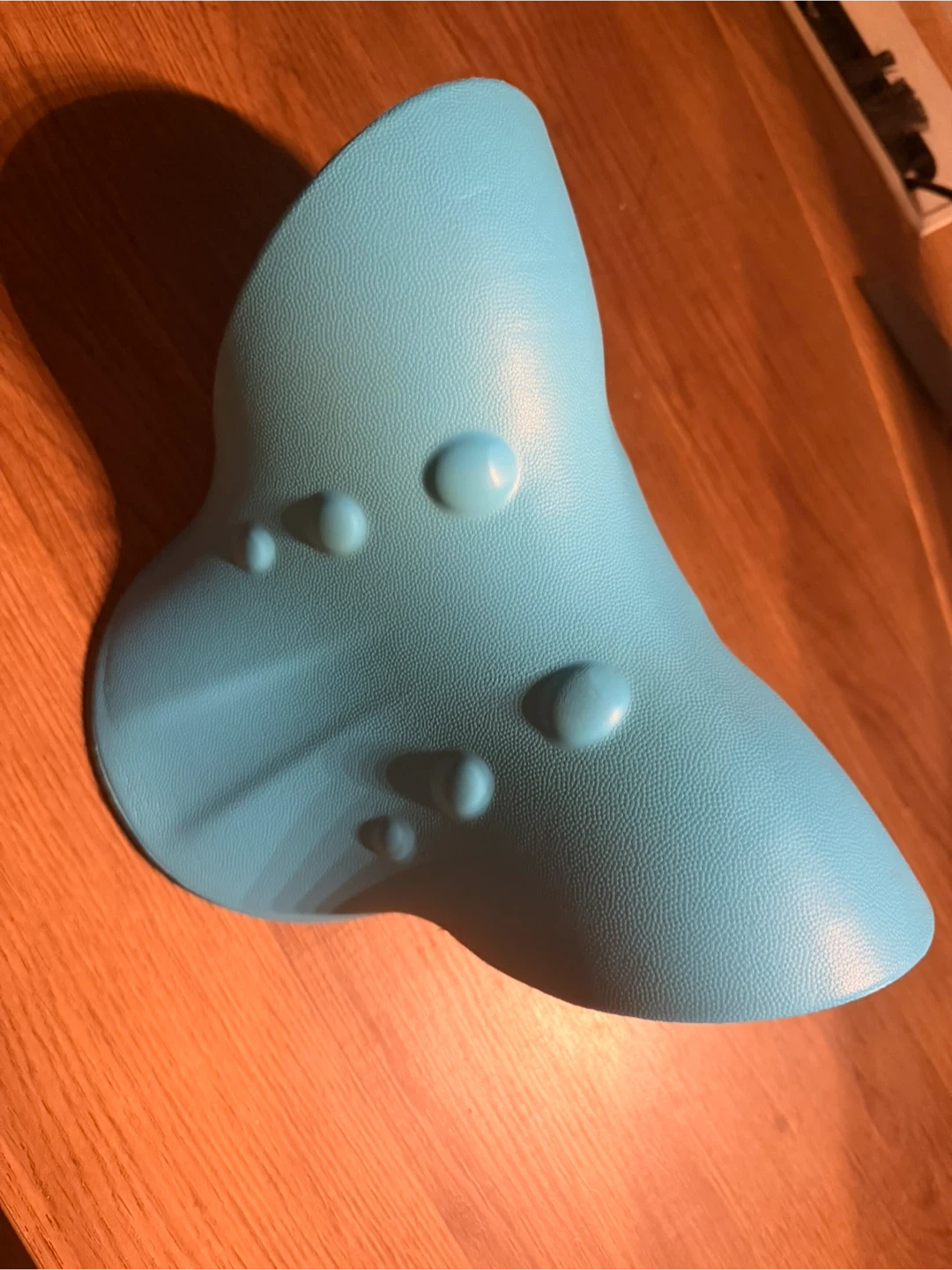 This blue P.Health neck pillow provides cervical traction. It's made of a textured material for grip. The unique shape supports the neck for relaxation or stretching.