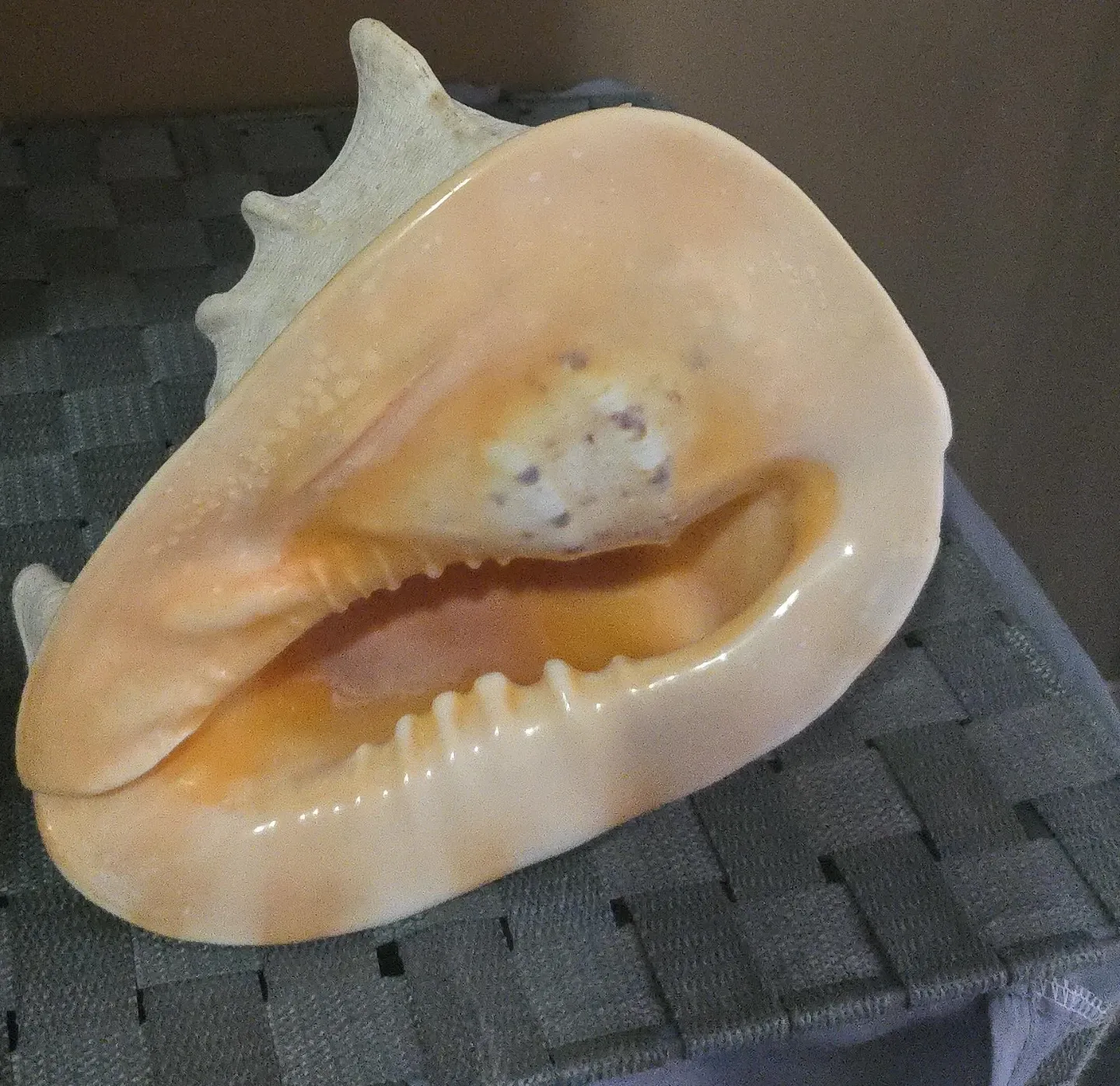 A beautiful, large conch shell with natural orange and purple markings. It's approximately 8 inches long and 5 inches wide. Great for home decor!
