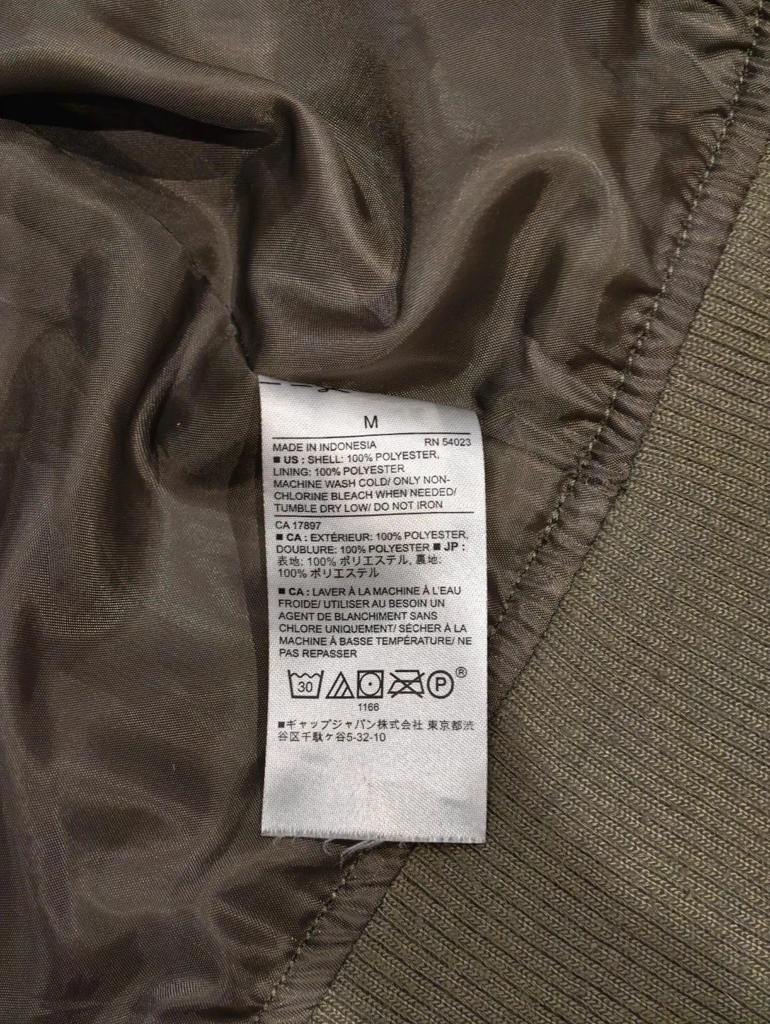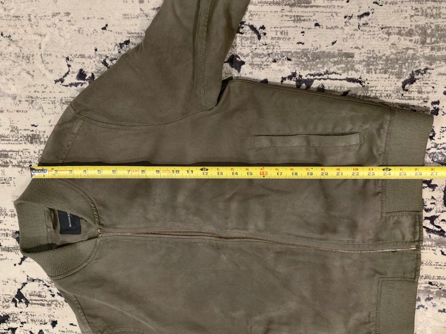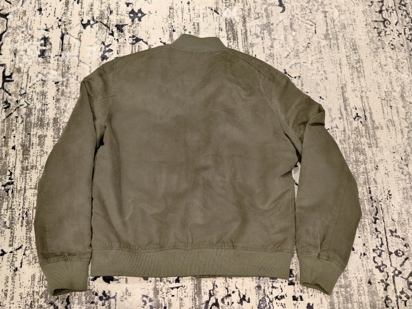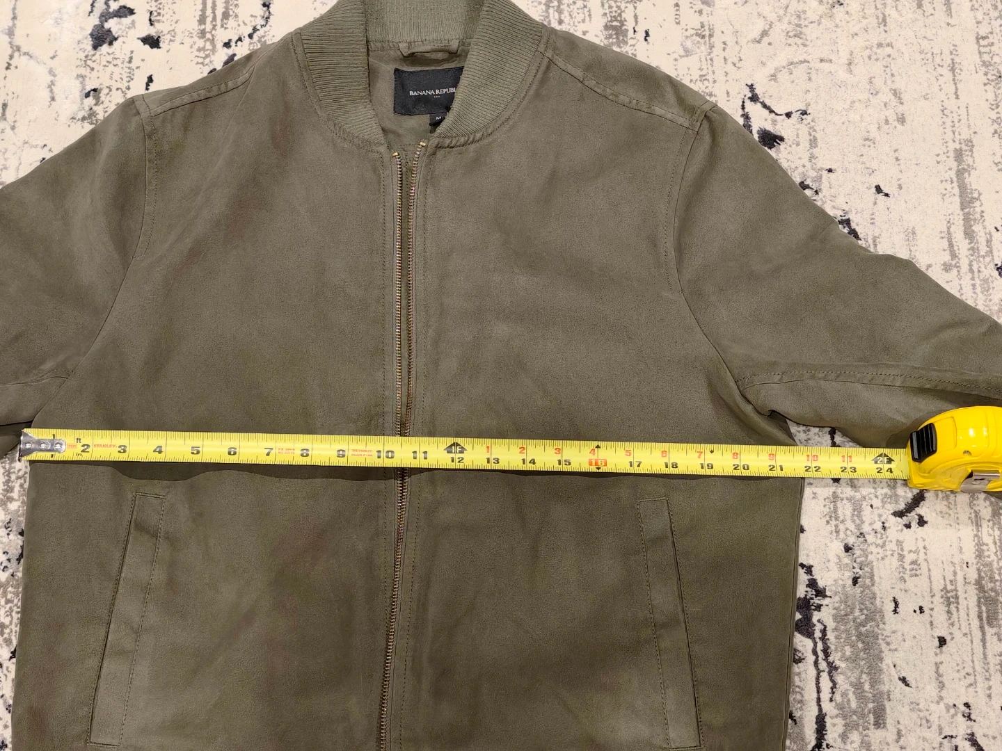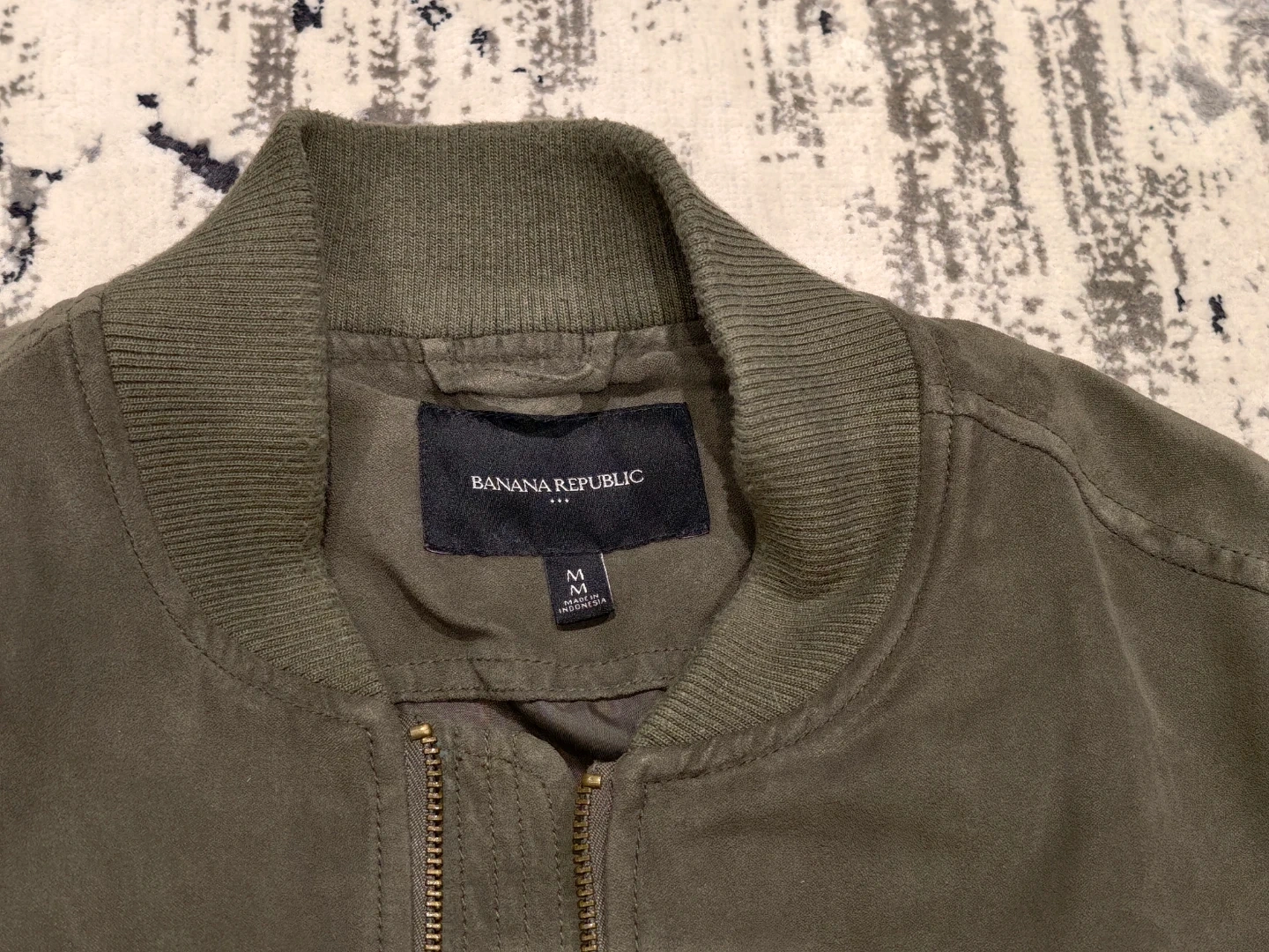 This Banana Republic bomber jacket is a size medium. It's like a micro suede on the exterior made with a polyester shell and lining. This jacket is olive green in colour.