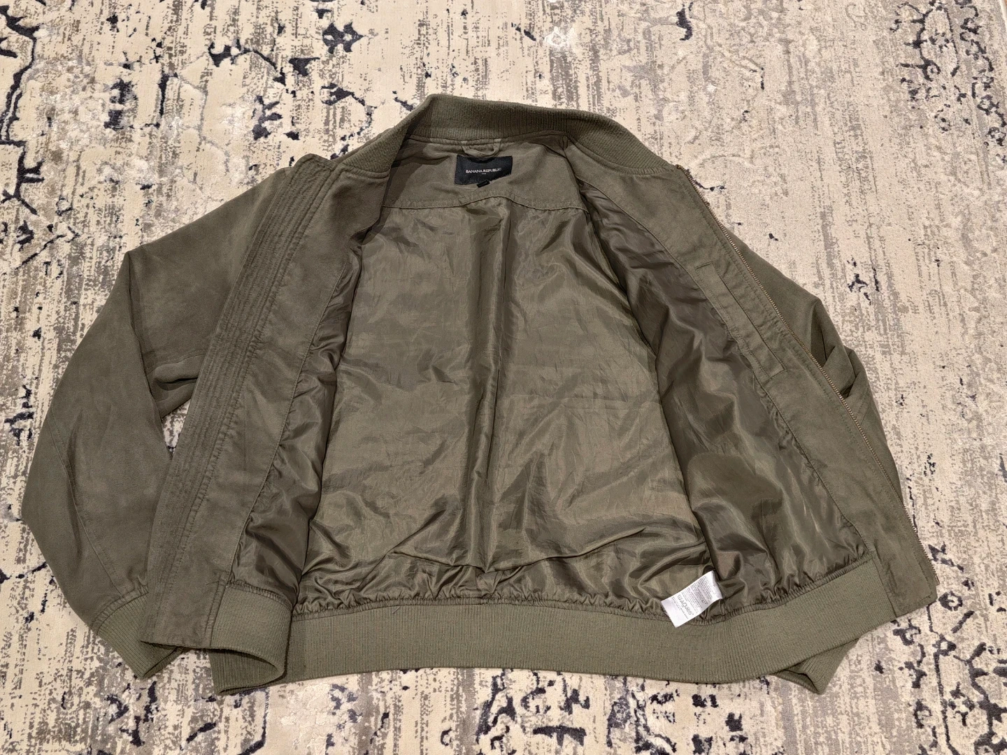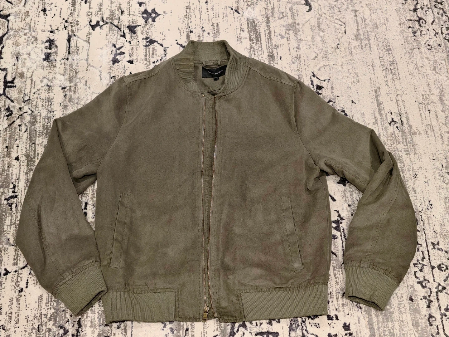 This Banana Republic bomber jacket is a size medium. It's like a micro suede on the exterior made with a polyester shell and lining. This jacket is olive green in colour.
