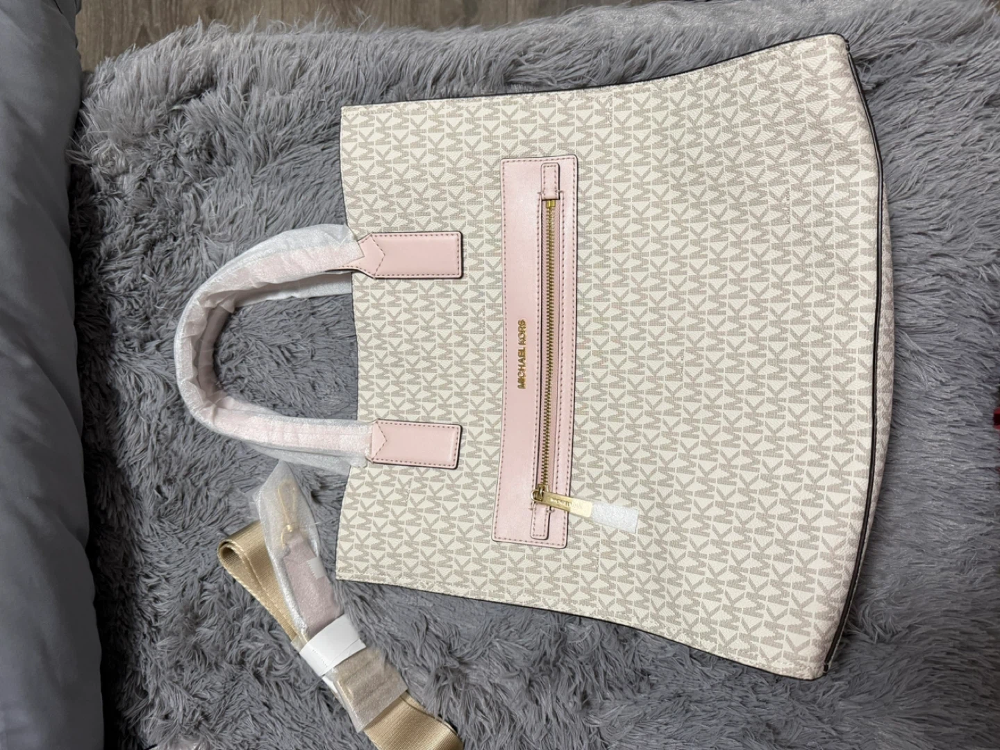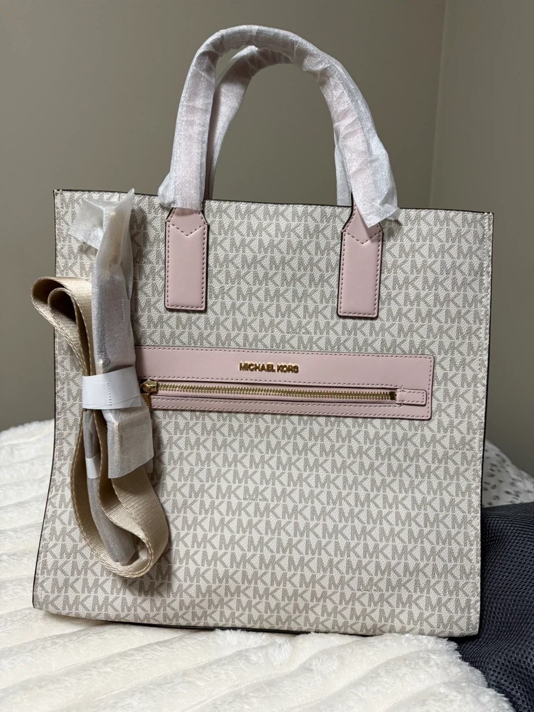 This is a brand new Michael Kors convertible tote bag! It is a cream colour with the MK logo pattern and light pink details. It also comes with a shoulder strap.