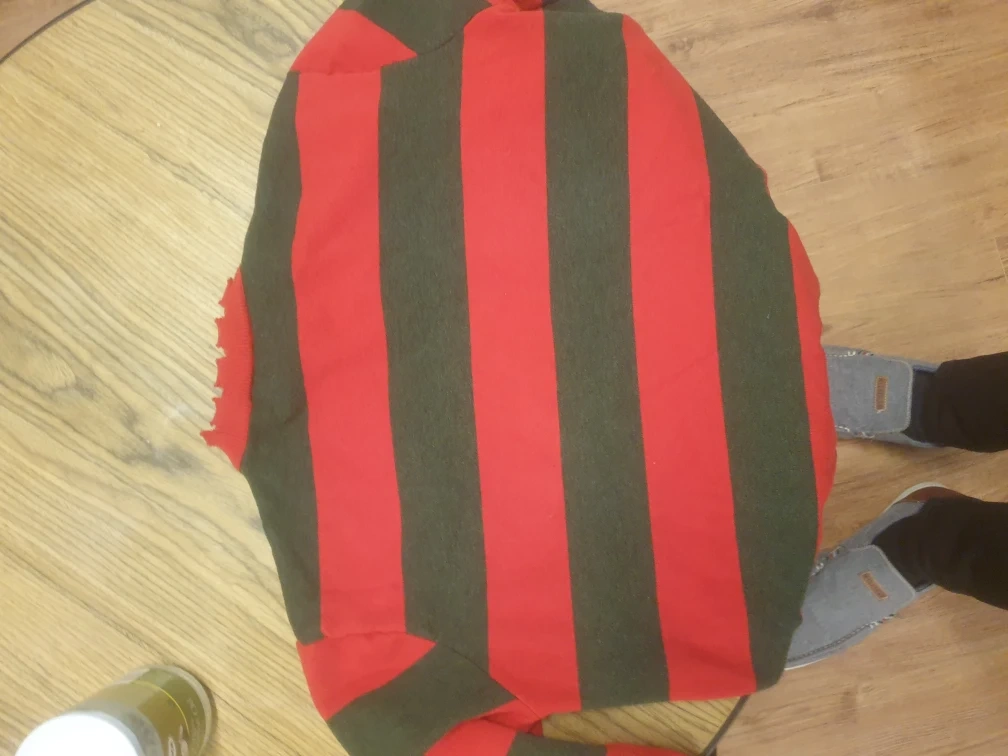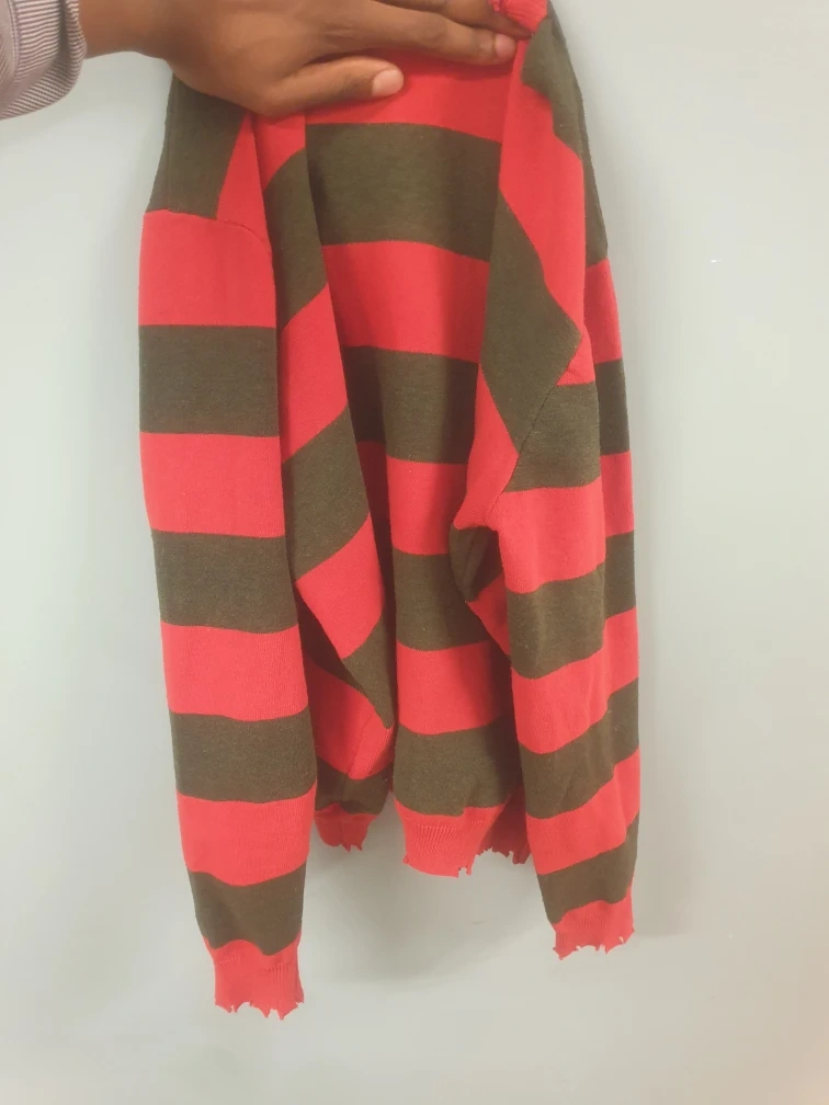 Striped long-sleeved sweater. Red and dark green horizontal stripes. Some fraying at the neckline and cuffs. Looks cozy.