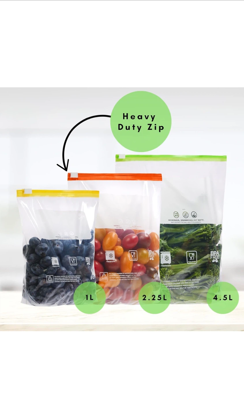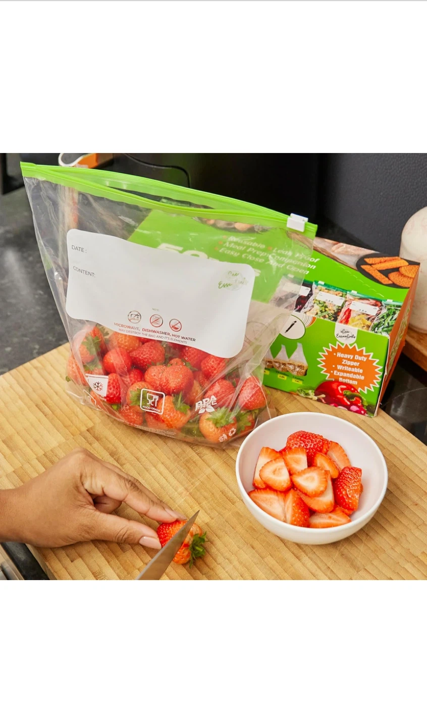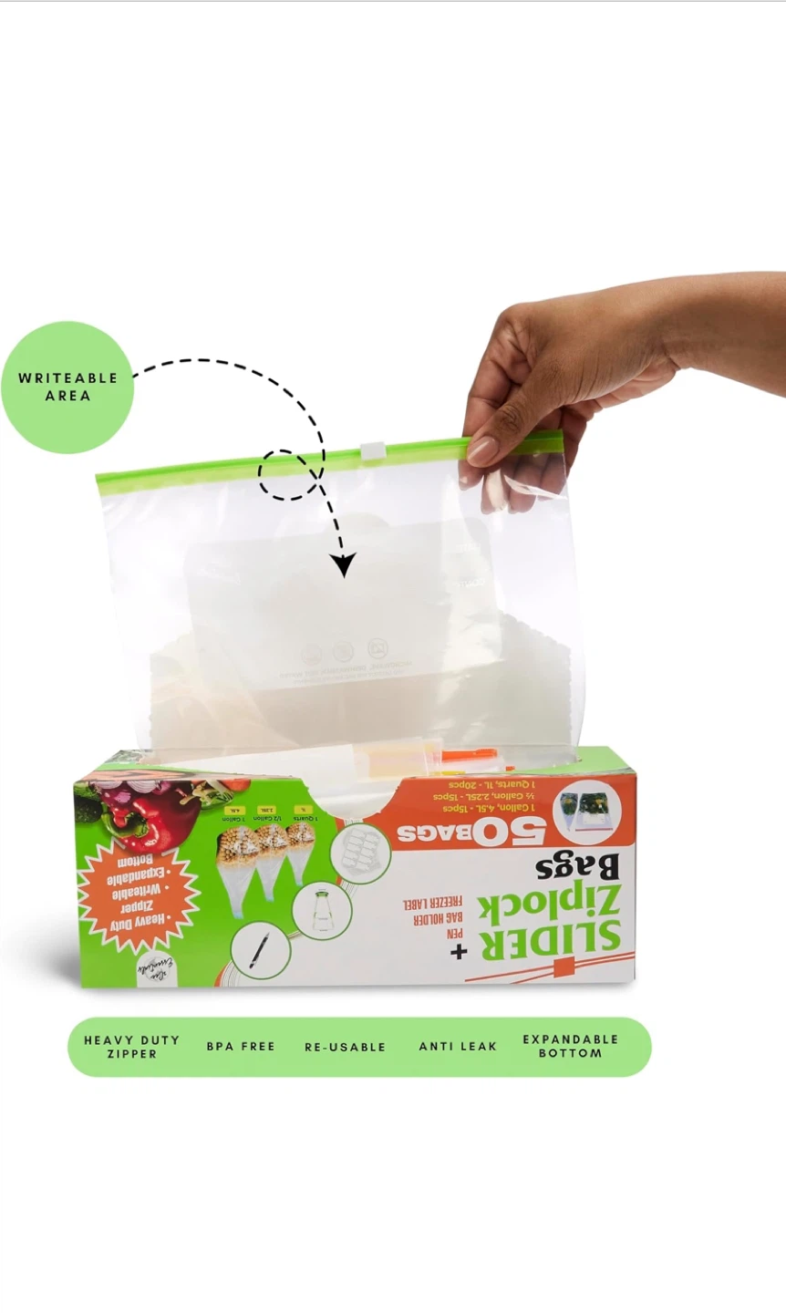 Get organized with these 2CEE Essentials Slider Ziplock Bags! This set includes 50 bags, plus 50 stickers, a pen, and a bag holder. These bags are reusable and leak-proof, making them perfect for meal prep and storage. They're designed with an easy close and open slider, and they're made from food-grade, non-BPA material.