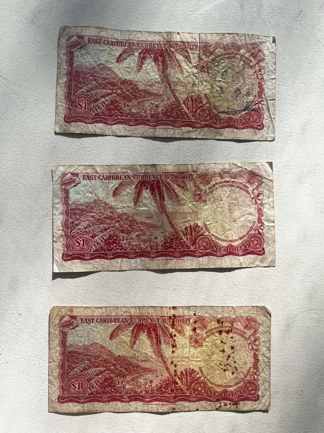 Three $1 banknotes from the East Caribbean Currency Authority 1965. Features a palm tree and island scenery on one side, and a portrait on the other. These are legal tender notes for the payment of any amount. Great for collectors!