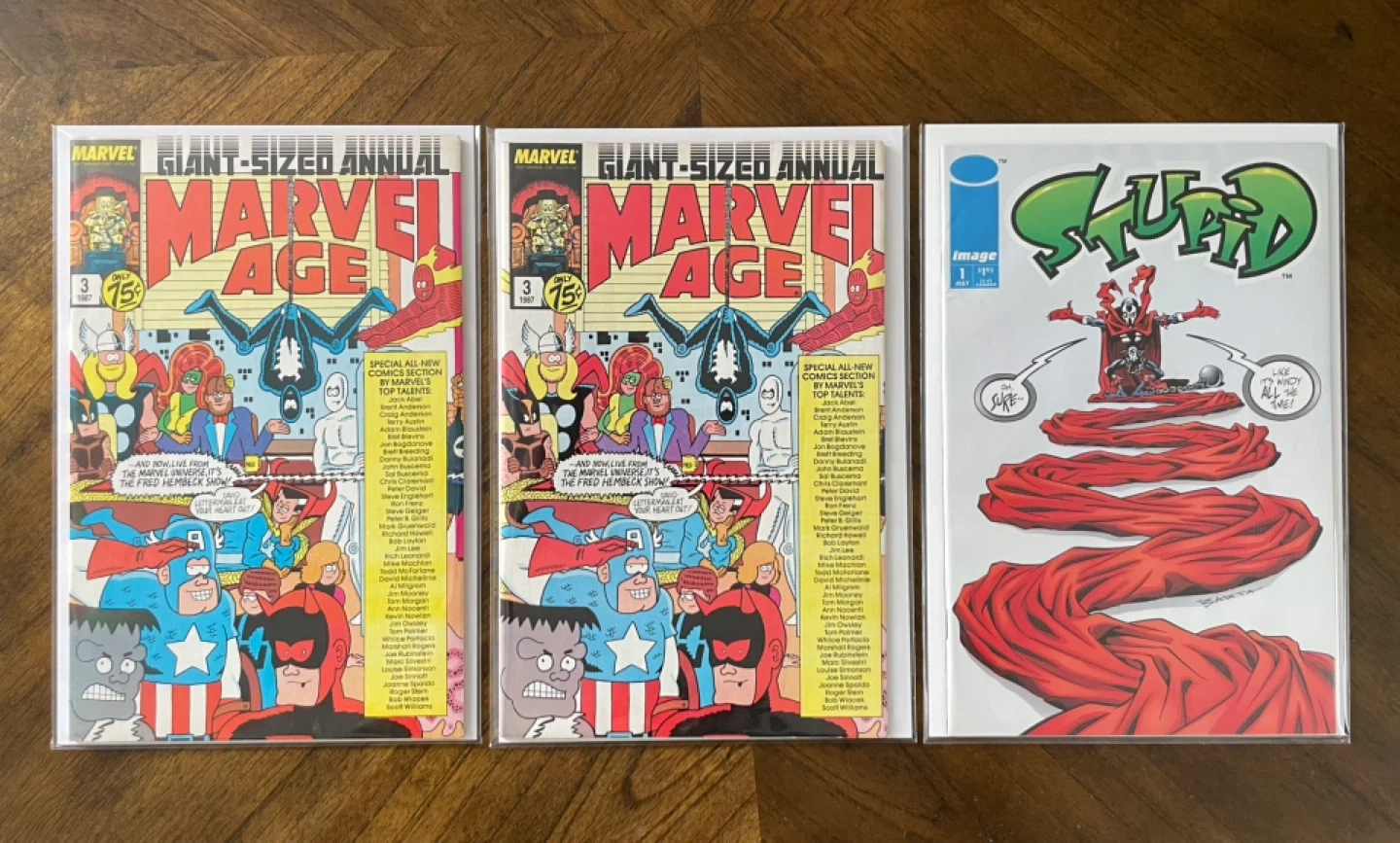 Three Marvel Age Giant-Size Annual comic books featuring "The Fred Hembeck Show". One Image Comics "Stupid" #1 comic is also included. Great for comic collectors! Ask for price
