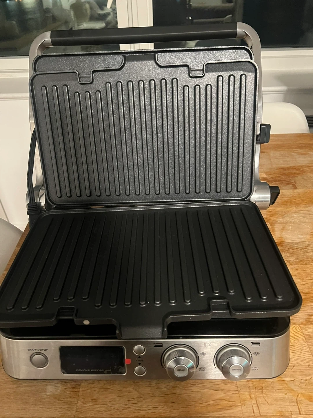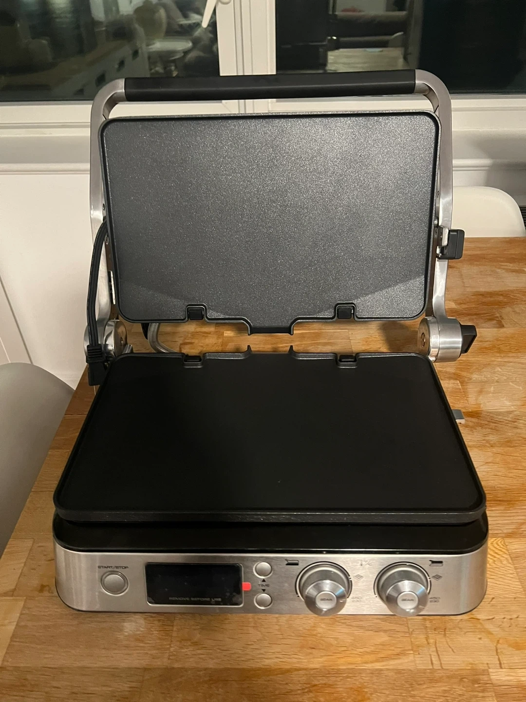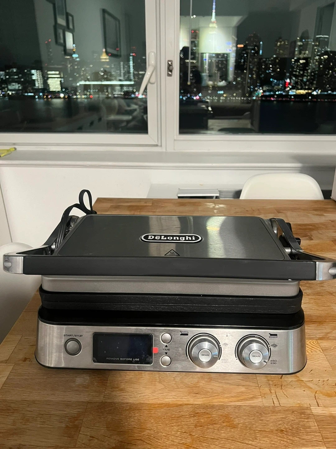 This is a De'Longhi electric grill. It features two sets of grill plates for versatile cooking. The control panel includes a start/stop button and adjustable temperature knobs. It’s brand new - we only used it once.