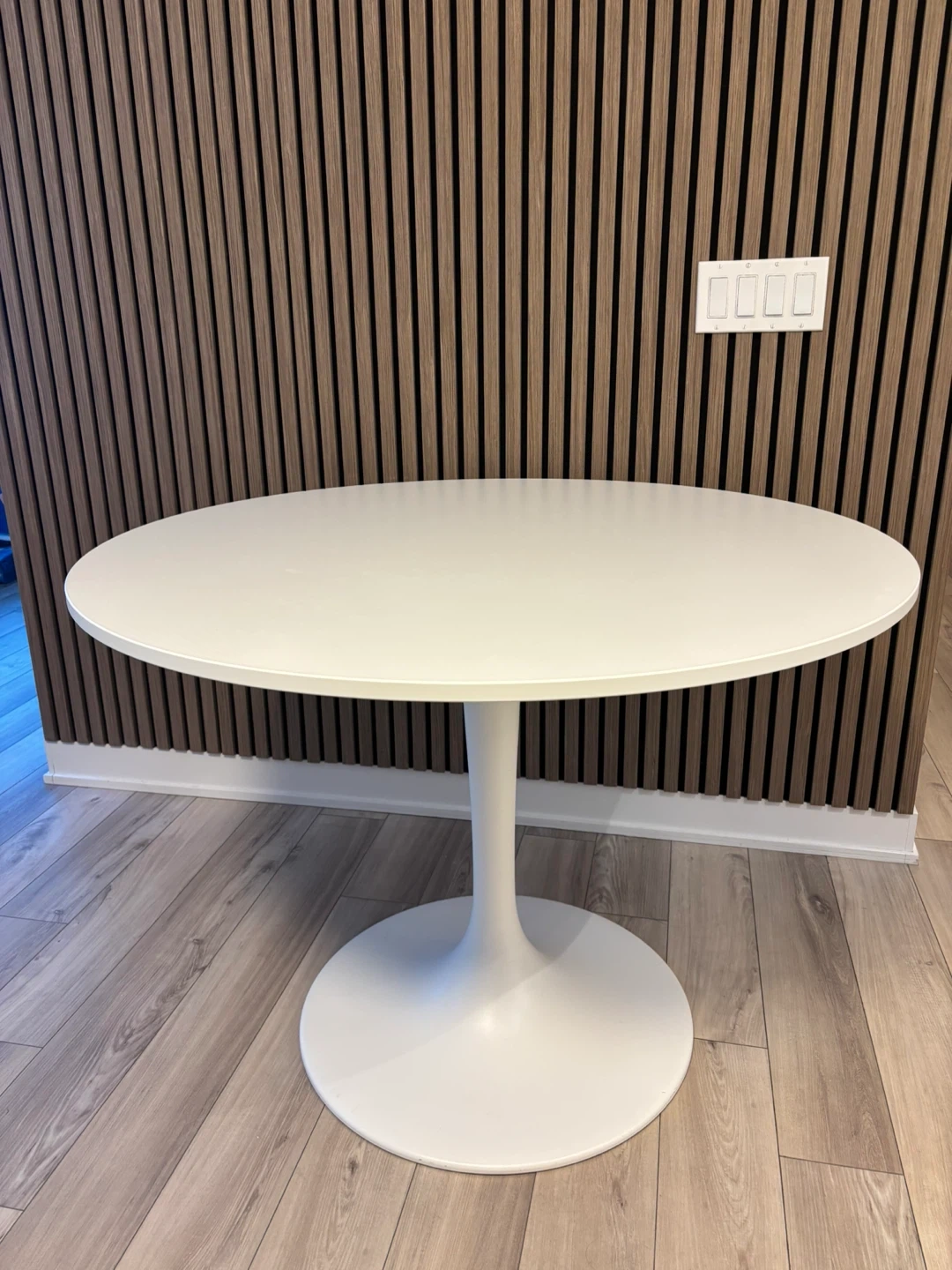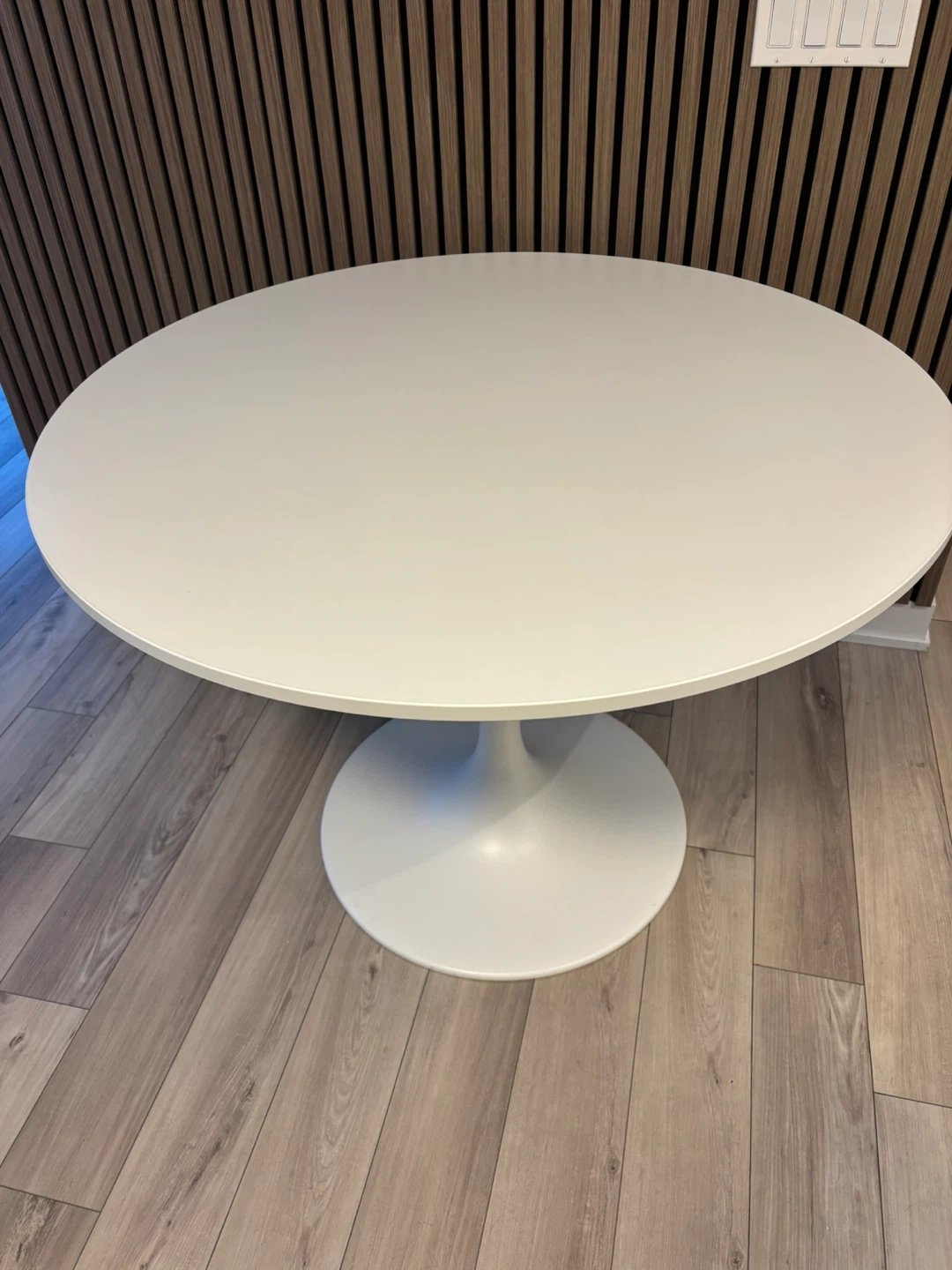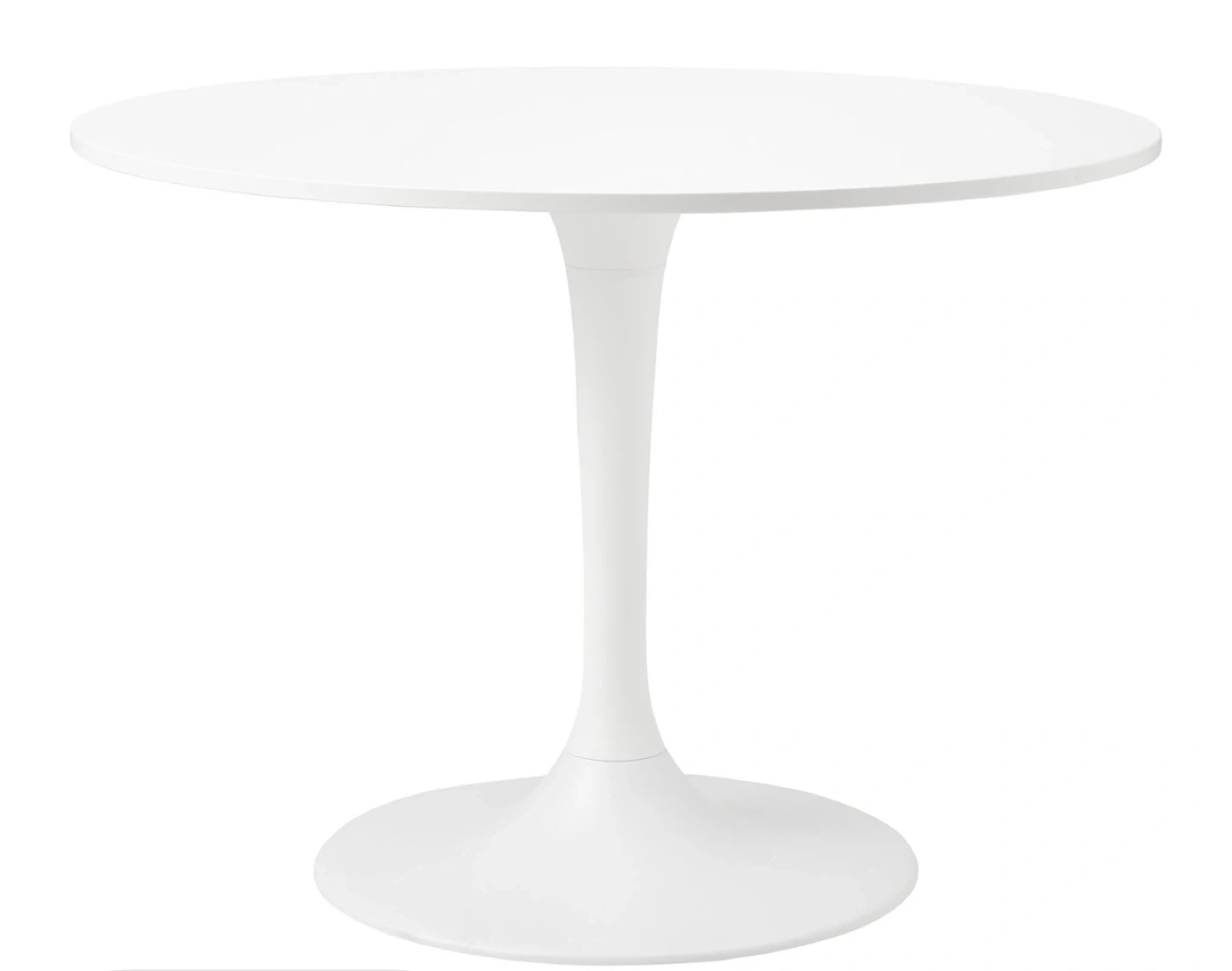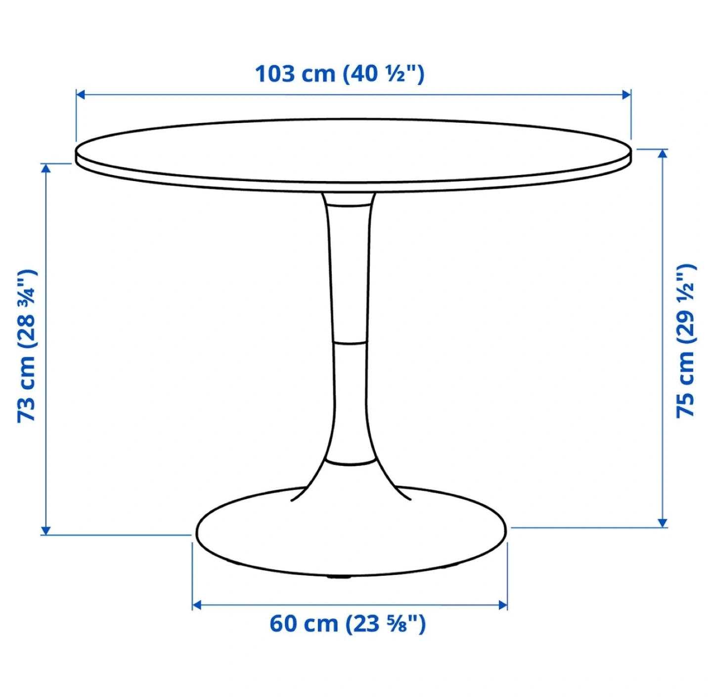 White round dining table with a pedestal base. Diameter is 103 cm and height is 75 cm. It's a great size for smaller dining areas. Base diameter is 60 cm.