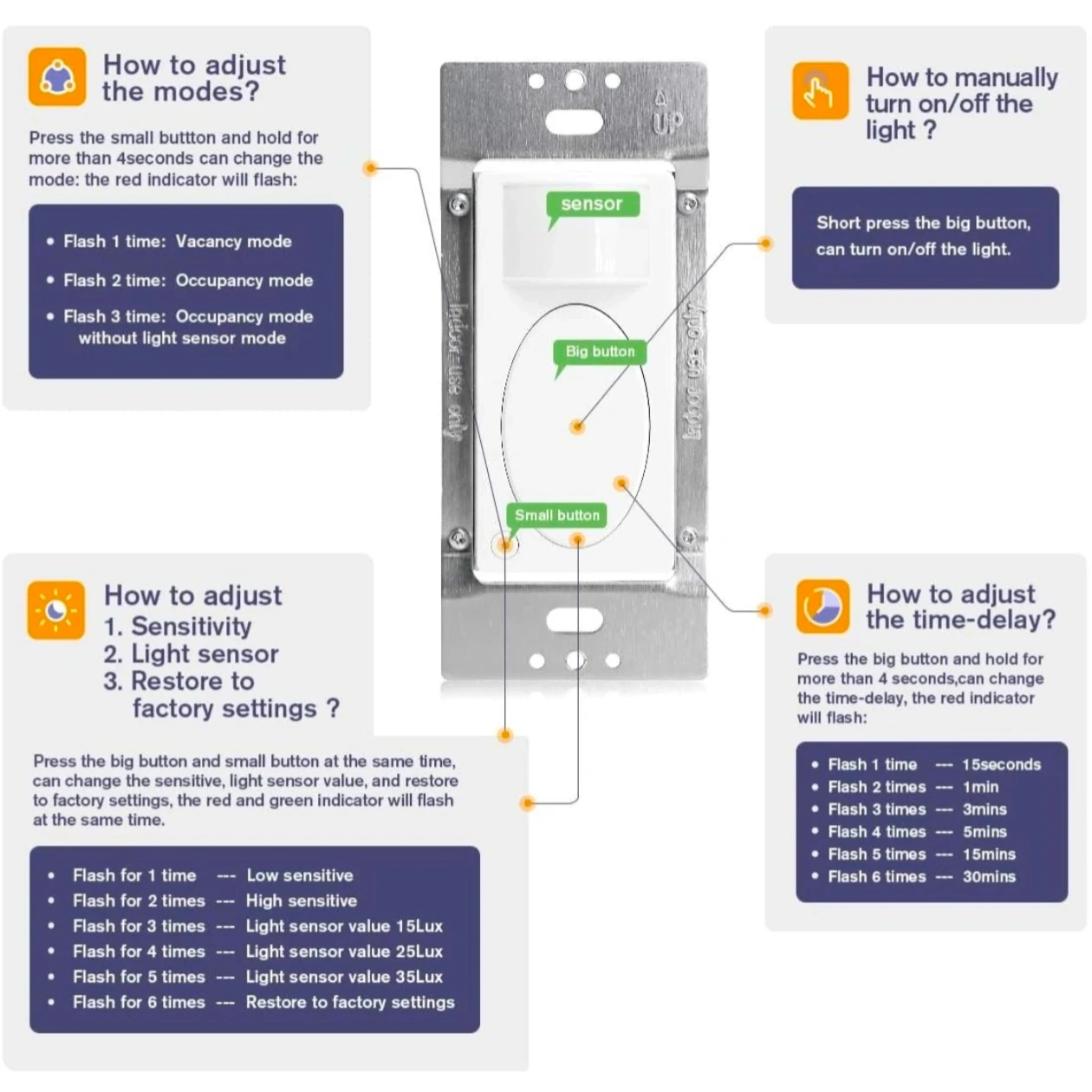 - Time-Delay: Default 1min (15secs, 1min,3mins 5mins, 15mins, 30mins adjustable)