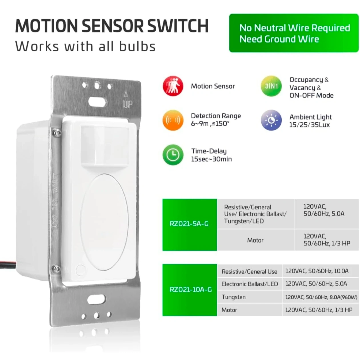 Selling a Rayzeek motion sensor Switch RZ021-10A-G. It has 3-in-1 occupancy, vacancy, and on-off modes.