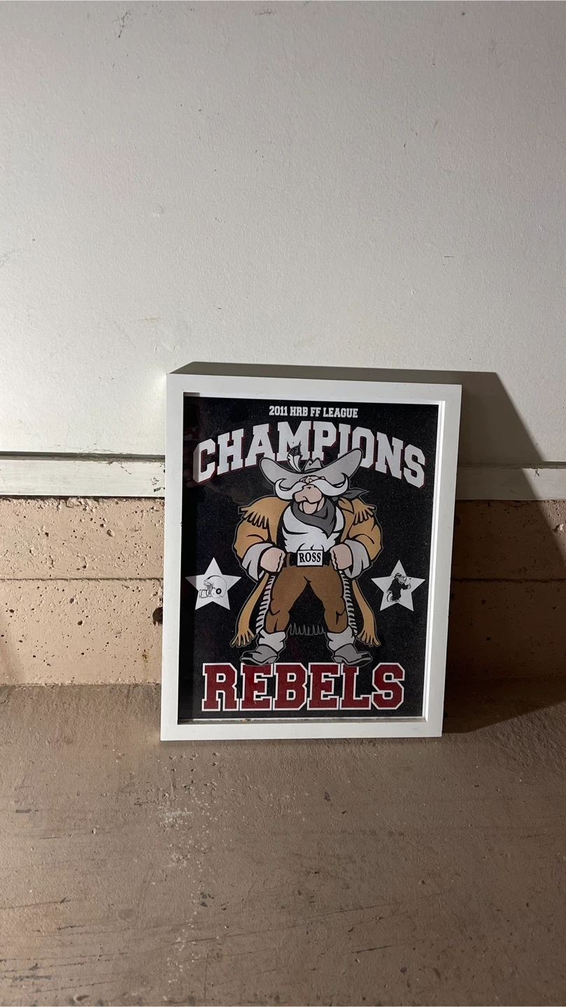 Framed art featuring the Ross Rebels, celebrating their 2011 HRB FF League championship. The frame is white and the artwork is in excellent condition. Perfect for a fan or collector!