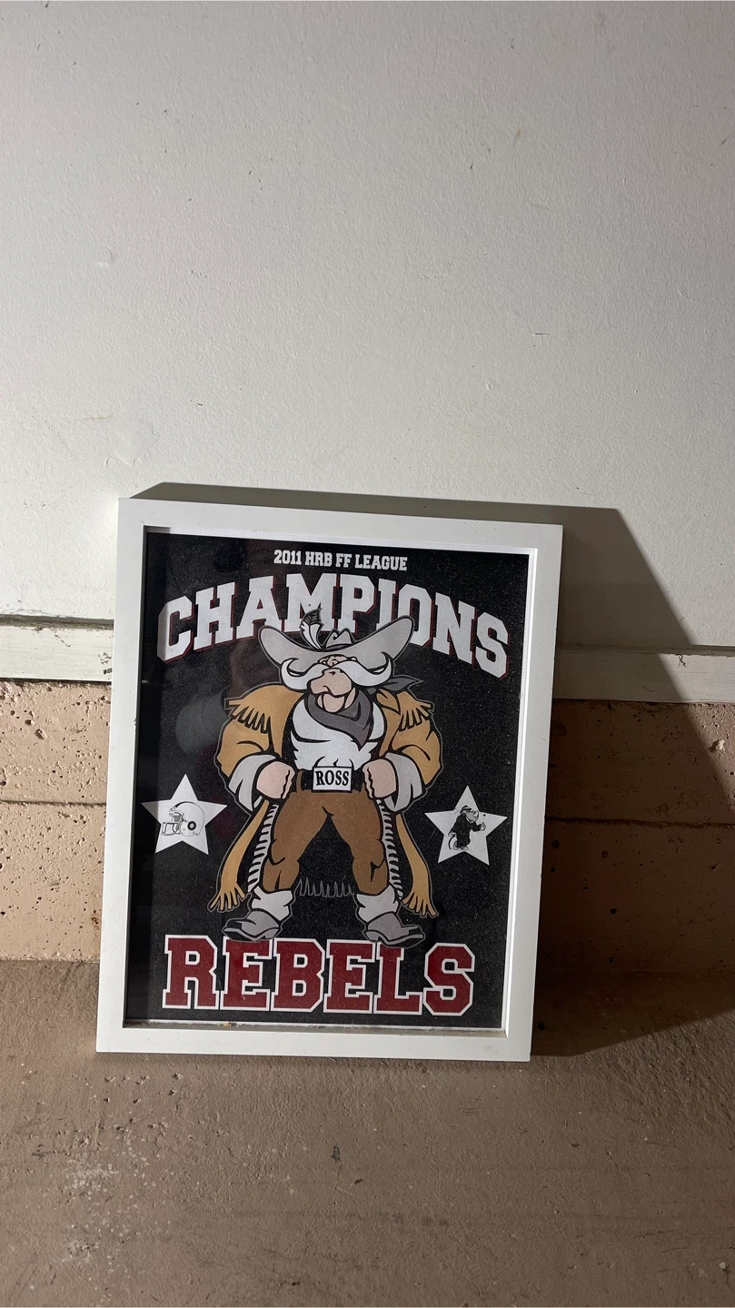 Framed art featuring the Ross Rebels, celebrating their 2011 HRB FF League championship. The frame is white and the artwork is in excellent condition. Perfect for a fan or collector!