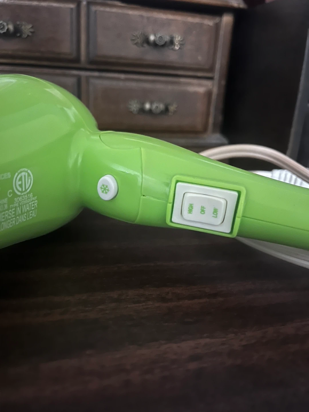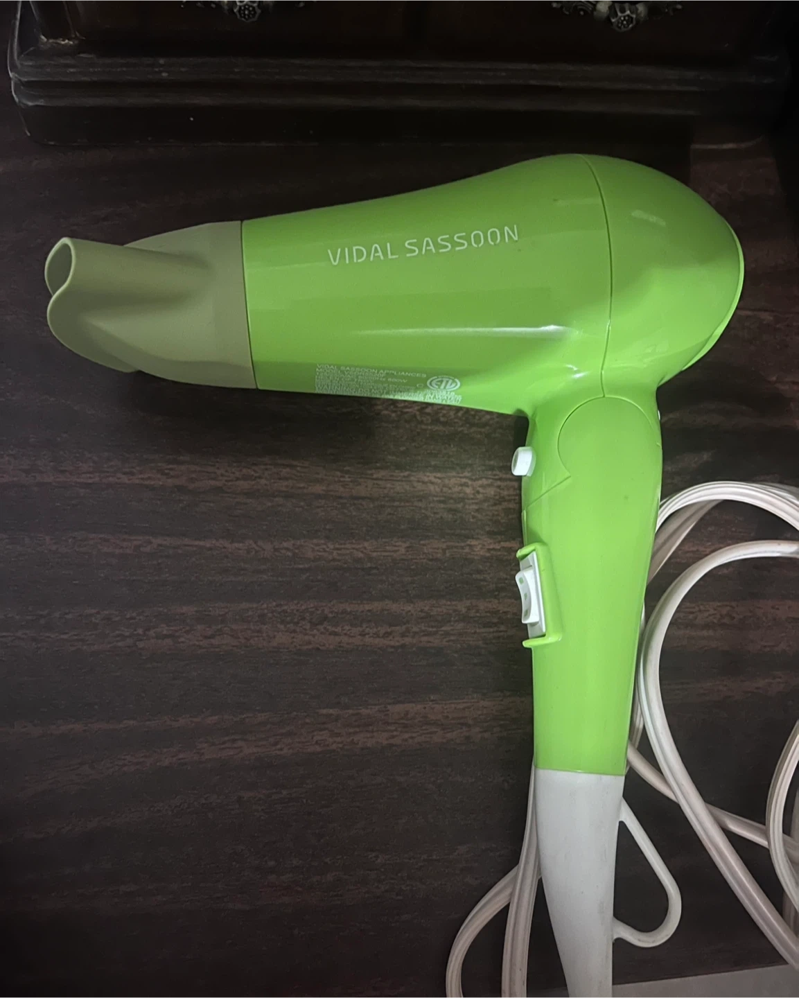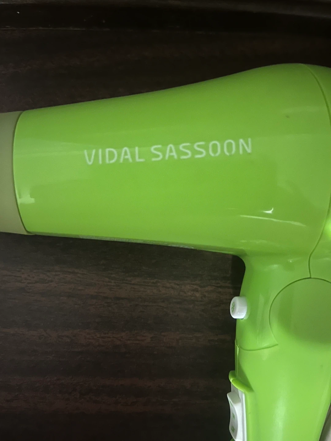 This is a green Vidal Sassoon hair dryer. It has high, low, and off settings. It also features a cool shot button.