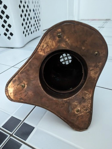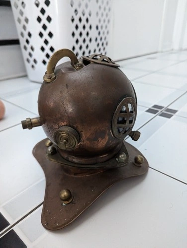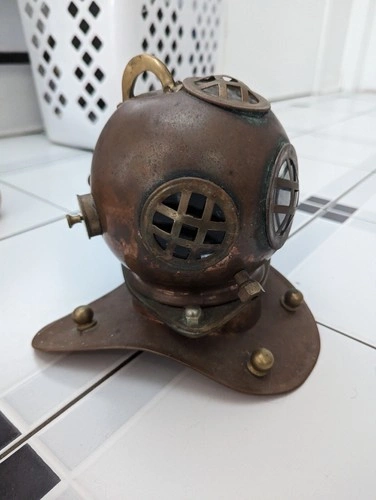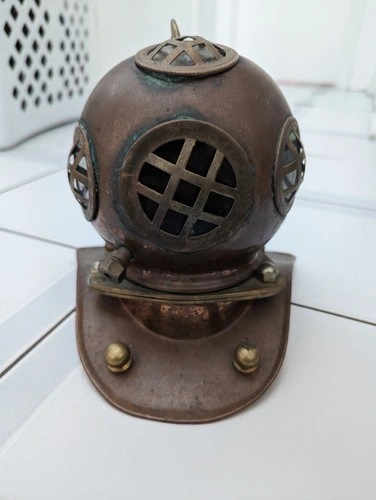 This is a replica of a copper and brass deep sea diving helmet, perfect for steampunk or marine decor. It measures 7 inches.