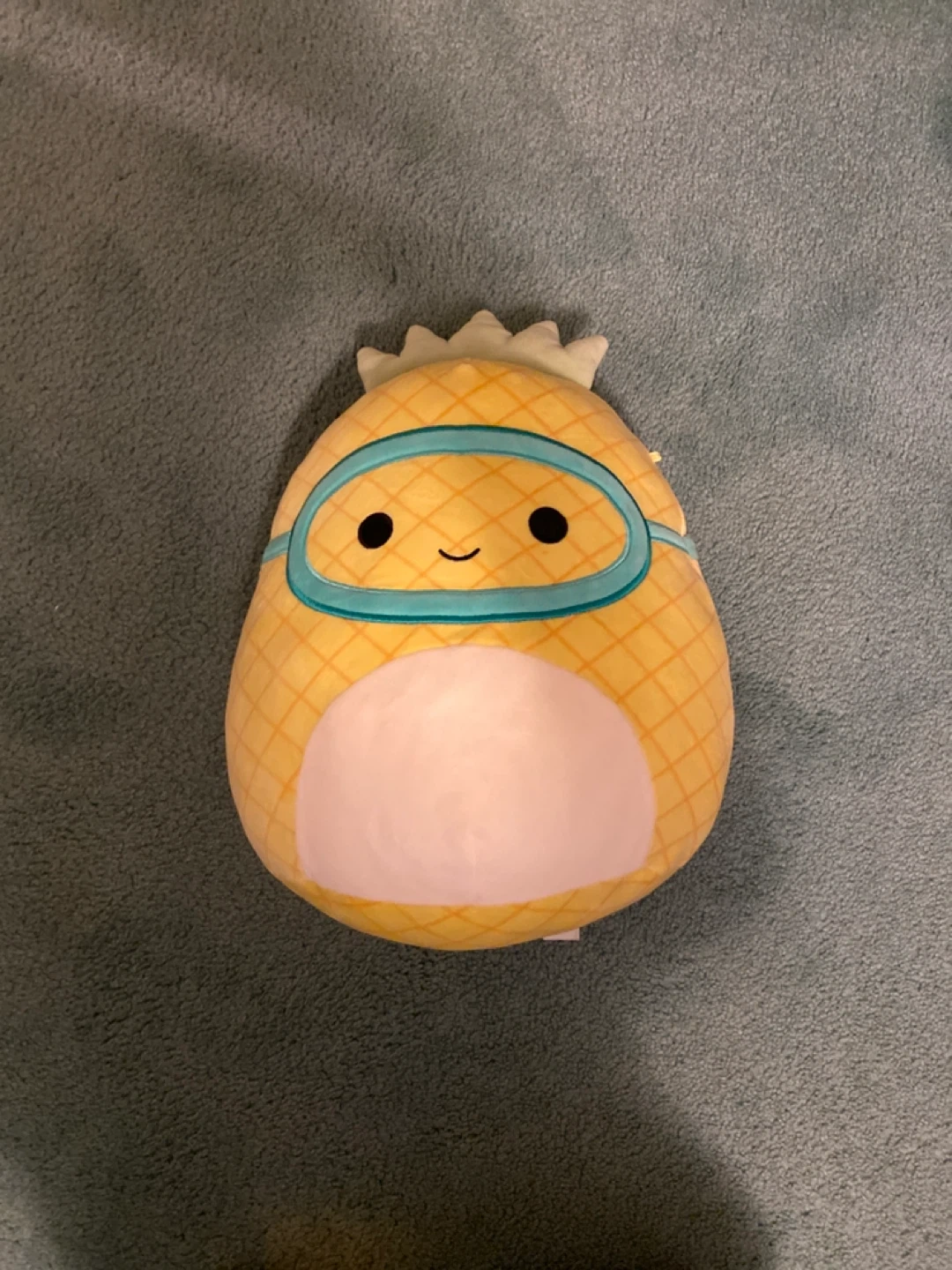 This is a squishy pineapple plush toy. It's yellow with a blue headband and goggles. Made with soft, huggable material.
