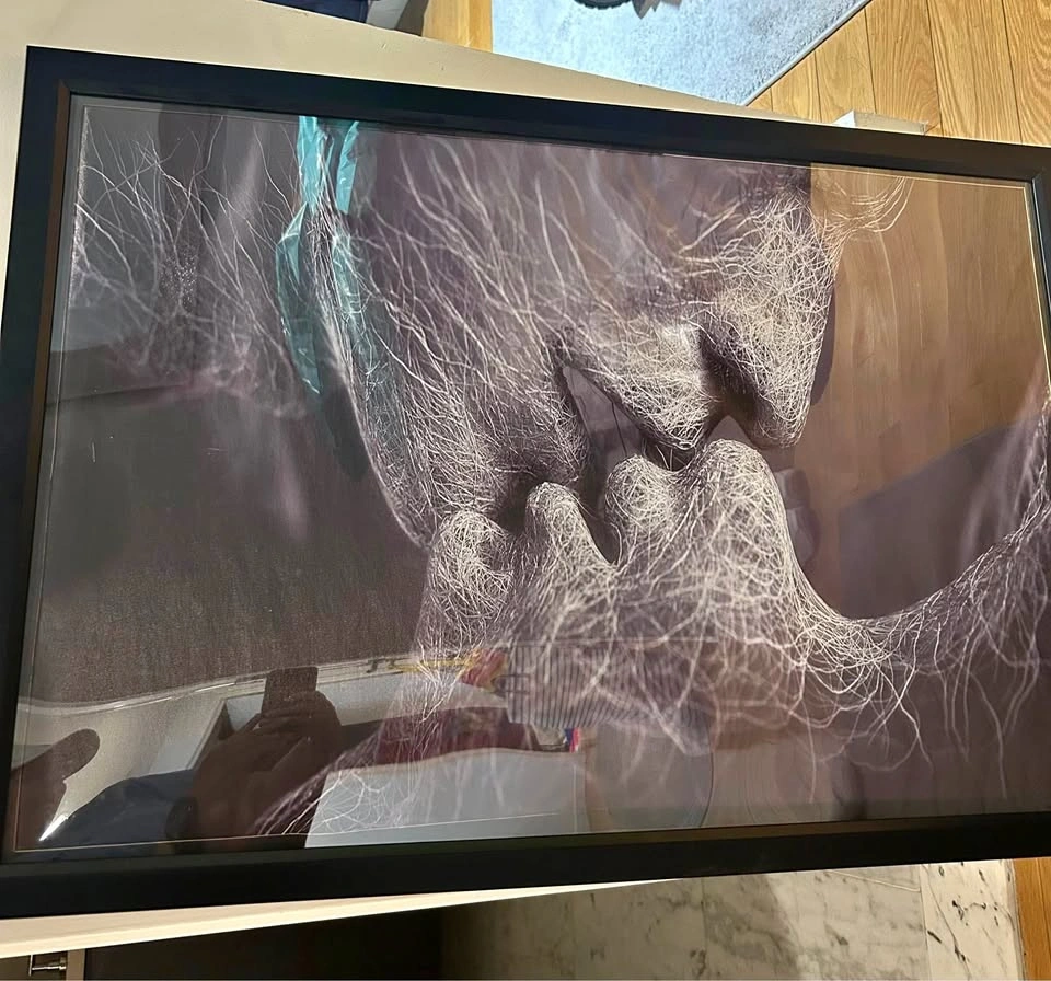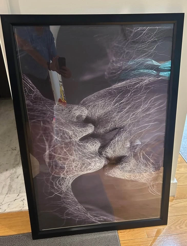 Modern framed art print with a cool abstract design featuring white lines forming two figures. Good for living room or bedroom decor. Not professionally framed but a great print.