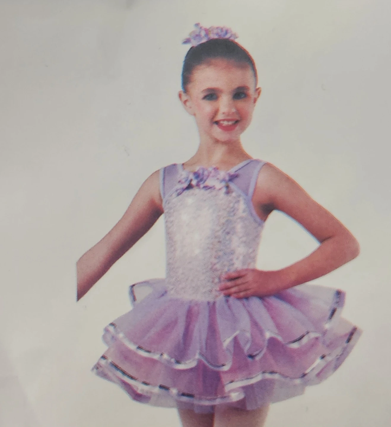 This sparkly leotard features a sequined bodice and a layered tutu skirt in purple and pink. It comes with a matching floral hair clip. It's perfect for dance recitals or dress-up fun!original price $48.