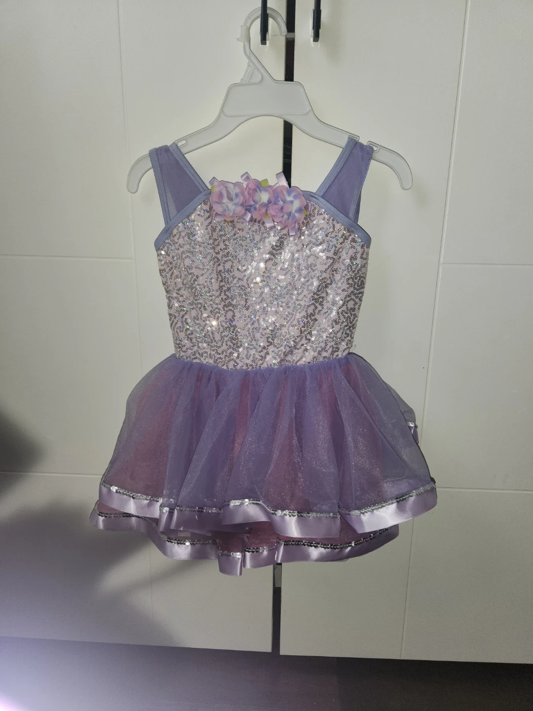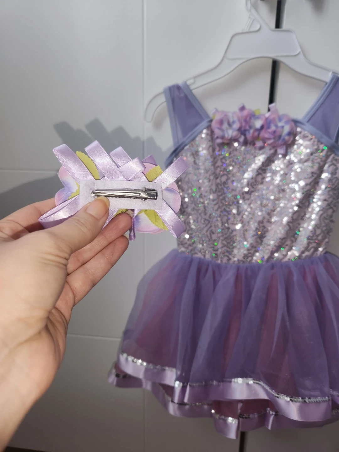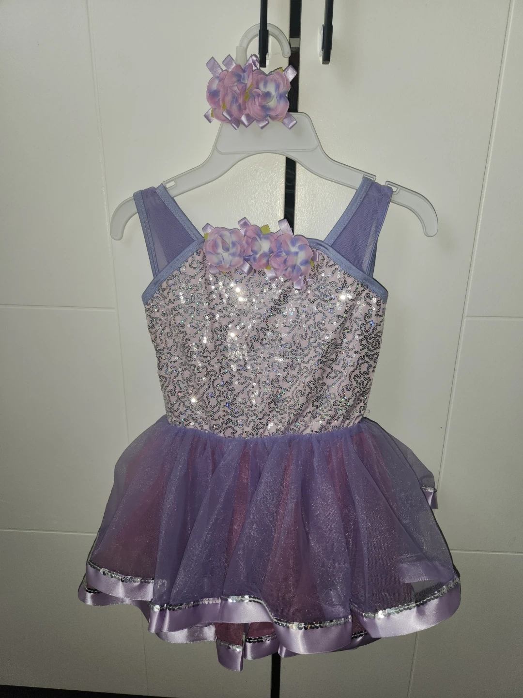This sparkly leotard features a sequined bodice and a layered tutu skirt in purple and pink. It comes with a matching floral hair clip. It's perfect for dance recitals or dress-up fun!original price $48.