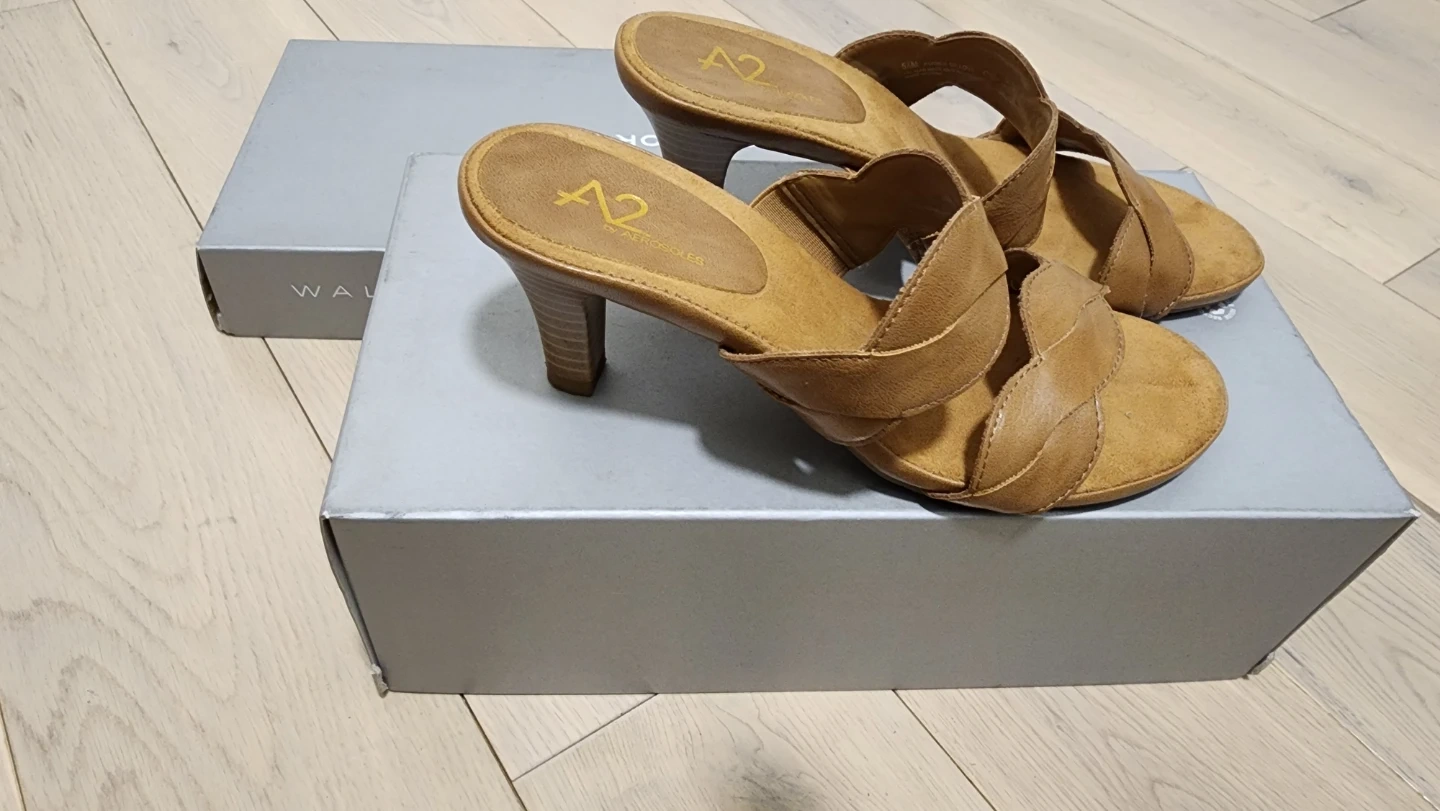These A2 by Aerosoles slip-on heeled sandals are a stylish choice for any occasion. The criss-cross strap design offers a unique look. Heel height appears to be approximately 3 inches. Comes with original box.