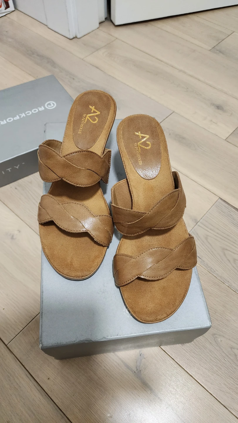 These A2 by Aerosoles slip-on heeled sandals are a stylish choice for any occasion. The criss-cross strap design offers a unique look. Heel height appears to be approximately 3 inches. Comes with original box.