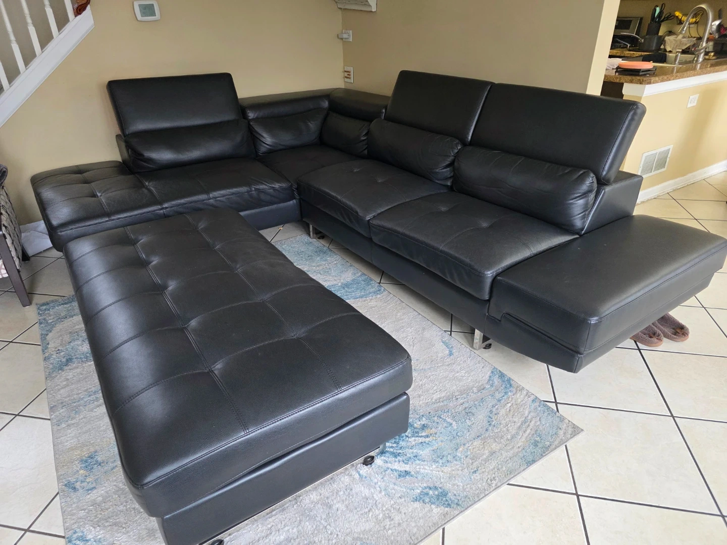 Spacious black leather sectional sofa with a matching tufted ottoman. This L-shaped couch offers ample seating. Black leather upholstery.