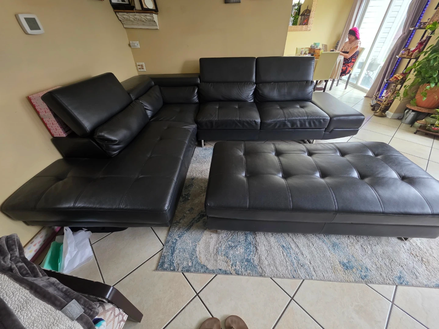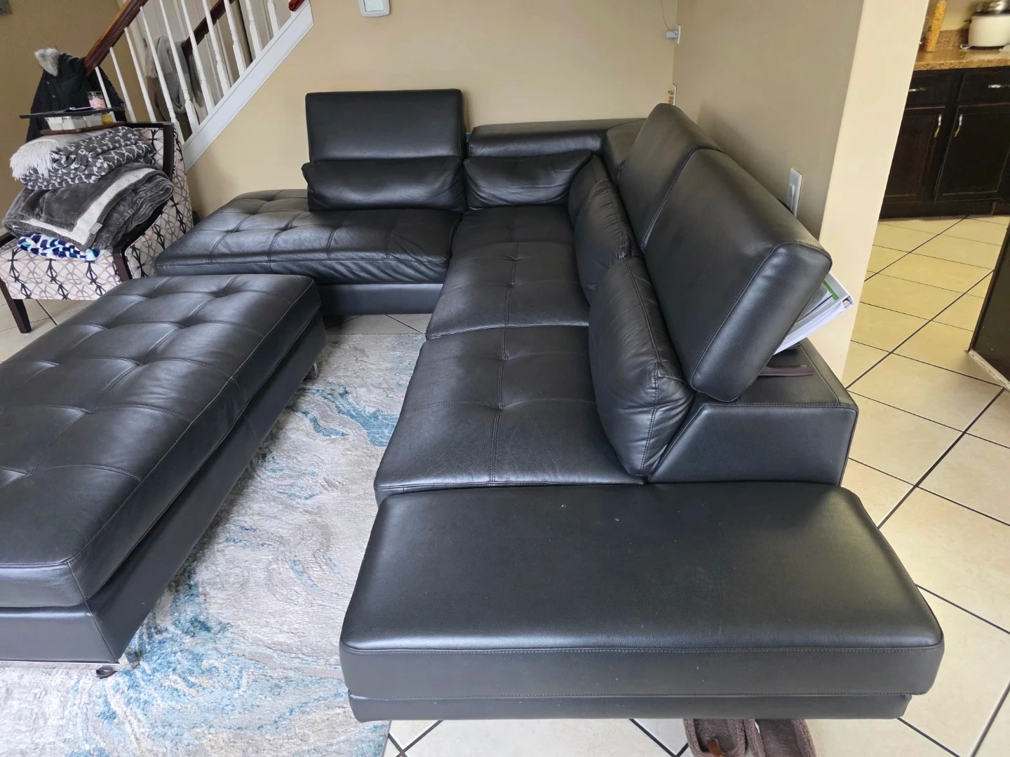 Spacious black leather sectional sofa with a matching tufted ottoman. This L-shaped couch offers ample seating. Black leather upholstery.